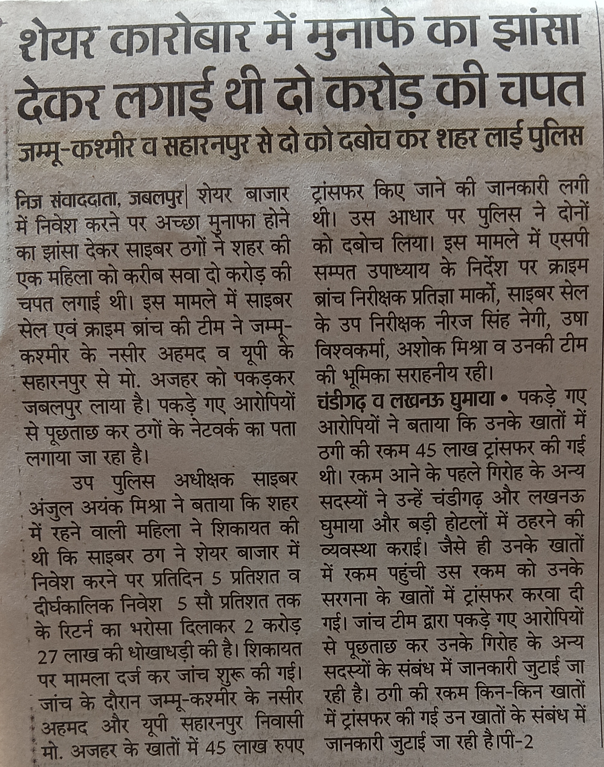 शेयर कारोबारी में मुनाफे का झांसा देकर लगाई थी दो करोड़ की चपत