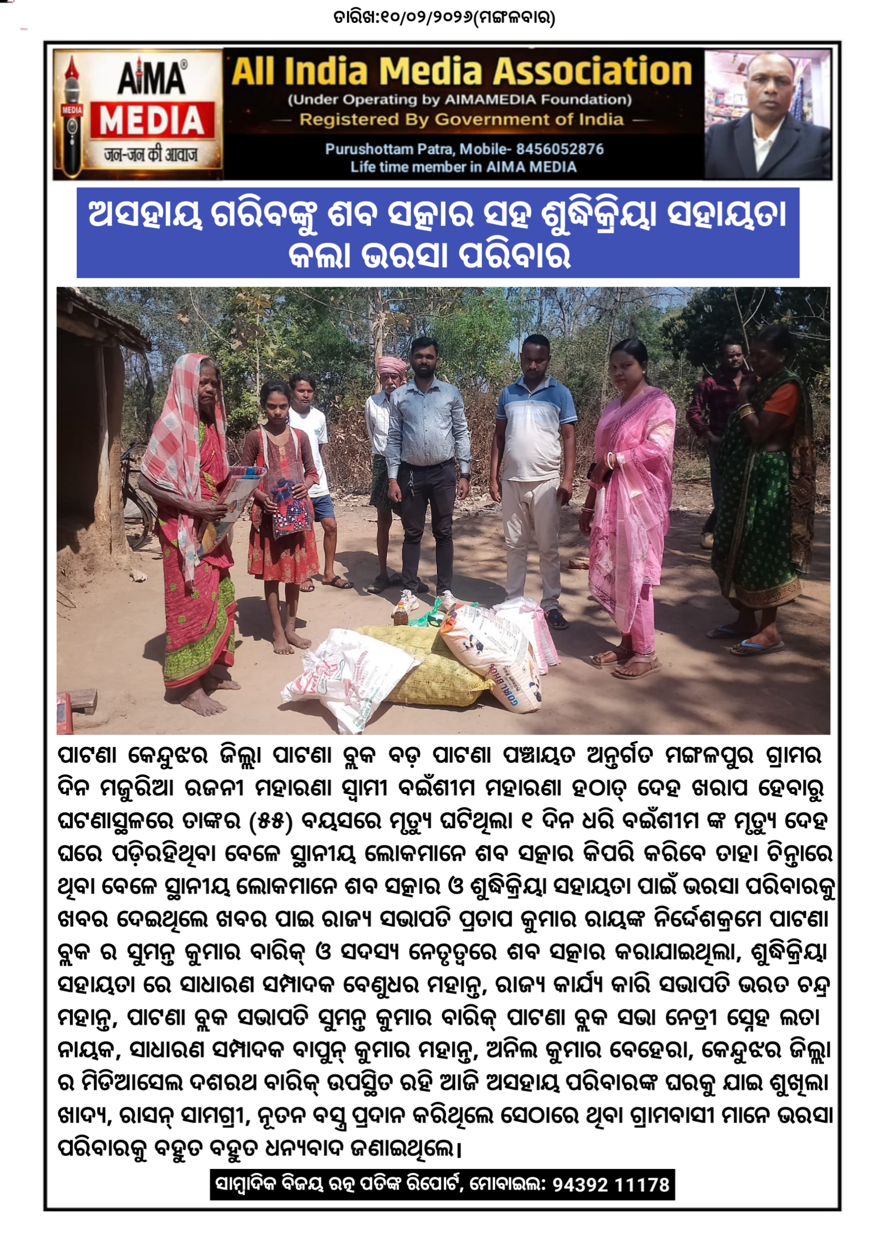 ପାଟଣା କେନ୍ଦୁଝର ଜିଲ୍ଲା ପାଟଣା ବ୍ଲକ ବଡ଼ ପାଟଣା ପଞ୍ଚାୟତ ଅନ୍ତର୍ଗତ ମଙ୍ଗଳପୁର ଗ୍ରାମର ଦିନ ମଜୁରିଆ ରଜନୀ ମହାରଣା ସ୍ବାମୀ ବଇଁଶୀମ ମହାରଣା ହଠାତ୍ ଦେହ ଖରାପ ହେବାରୁ ଘଟଣାସ୍ଥଳରେ ତାଙ୍କର (୫୫) ବୟସରେ ମୃତ୍ୟୁ ଘଟିଥିଲା ୧ ଦିନ ଧରି ବଇଁଶୀମ ଙ୍କ ମୃତ୍ୟୁ ଦେହ ଘରେ ପଡ଼ିରହିଥିବା ବେଳେ ସ୍ଥାନୀୟ ଲୋକମାନେ ଶବ ସତ୍କାର କିପରି କରିବେ ତାହା ଚିନ୍ତାରେ ଥିବା ବେଳେ ସ୍ଥାନୀୟ ଲୋକମାନେ ଶବ ସତ୍କାର ଓ ଶୁଦ୍ଧିକ୍ରିୟା ସହାୟତା ପାଇଁ ଭରସା ପରିବାରକୁ ଖବର ଦେଇଥିଲେ ଖବର ପାଇ ରାଜ୍ୟ ସଭାପତି ପ୍ରତାପ କୁମାର ରାୟଙ୍କ ନିର୍ଦ୍ଦେଶକ୍ରମେ ପାଟଣା ବ୍ଲକ ର ସୁମନ୍ତ କୁମାର ବାରିକ୍ ଓ ସଦସ୍ୟ ନେତୃତ୍ୱରେ ଶବ ସତ୍କାର କରାଯାଇଥିଲା, ଶୁଦ୍ଧିକ୍ରିୟା ସହାୟତା ରେ ସାଧାରଣ ସମ୍ପାଦକ ବେଣୁଧର ମହାନ୍ତ, ରାଜ୍ୟ କାର୍ଯ୍ୟ କାରି ସଭାପତି ଭରତ ଚନ୍ଦ୍ର ମହାନ୍ତ, ପାଟଣା ବ୍ଲକ ସଭାପତି ସୁମନ୍ତ କୁମାର ବାରିକ୍ ପାଟଣା ବ୍ଲକ ସଭା ନେତ୍ରୀ ସ୍ନେହ ଲତା ନାୟକ, ସାଧାରଣ ସମ୍ପାଦକ ବାପୁନ୍ କୁମାର ମହାନ୍ତ, ଅନିଲ କୁମାର ବେହେରା, କେନ୍ଦୁଝର ଜିଲ୍ଲା ର ମିଡିଆସେଲ ଦଶରଥ ବାରିକ୍ ଉପସ୍ଥିତ ରହି ଆଜି ଅସହାୟ ପରିବାରଙ୍କ ଘରକୁ ଯାଇ ଶୁଖିଲା ଖାଦ୍ୟ , ରାସନ୍ ସାମଗ୍ରୀ, ନୂତନ ବସ୍ତ୍ର ପ୍ରଦାନ କରିଥିଲେ