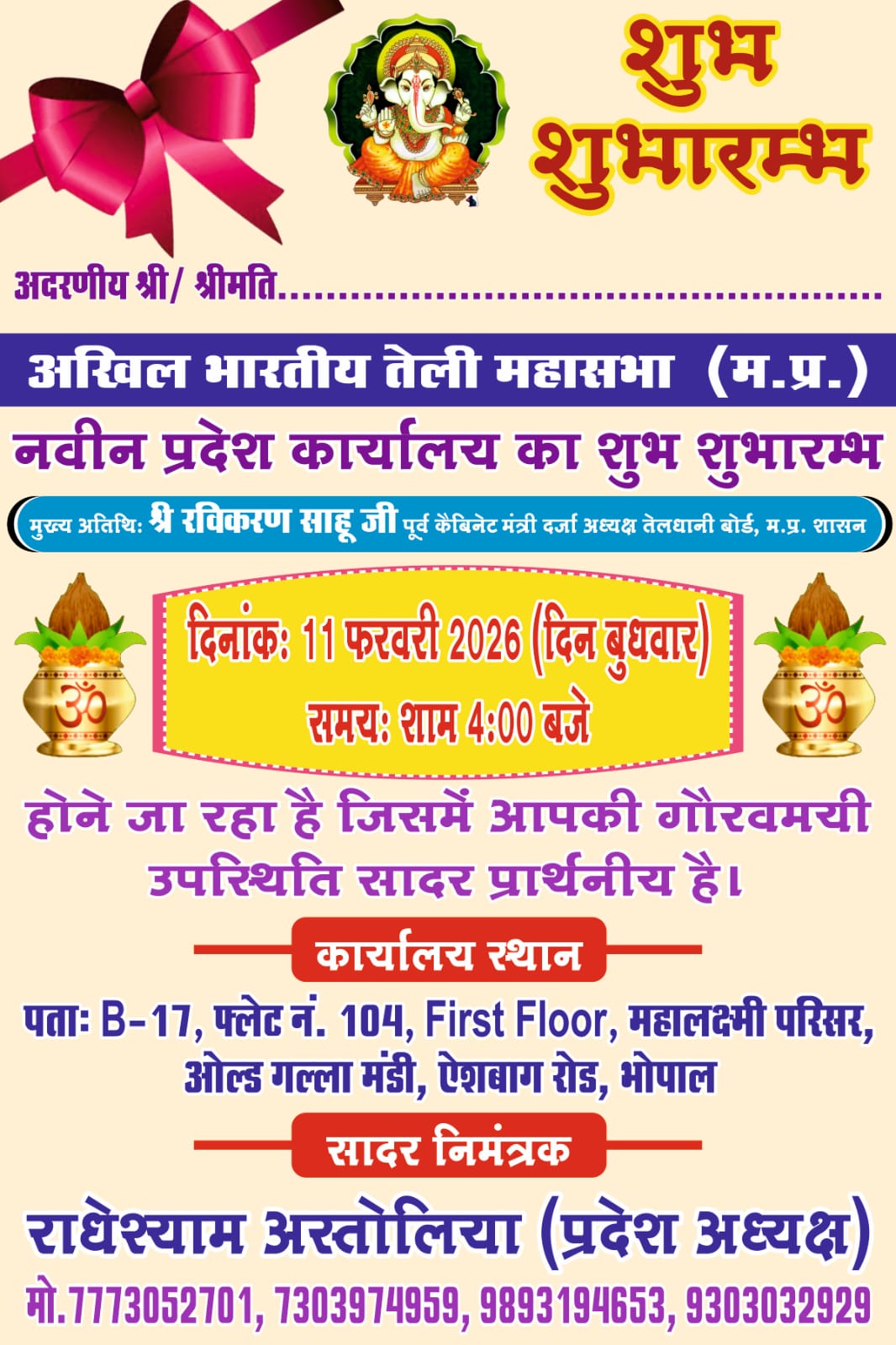 आयोजन में मुख्य अतिथिः मान. श्री रविकरण साहू जी पूर्व कैबिनेट मंत्री दर्जा अध्यक्ष तेलधानी बोर्ड, म.प्र. शासन एवं विशिष्ट सामाजिक जन ,गणमान्य सामाजिक जन रहेंगे। आयोजन दिनांक: 11 फरवरी 2026 (दिन बुधवार) समयः शाम 4:00 बजे सम्पन्न होगा। आप सभी की गौरवमयी उपस्थिति सादर प्रार्थनीय है।कार्यालय स्थान पताः B-17, फ्लेट नं. 104, First Floor, महालक्ष्मी परिसर, ओल्ड गल्ला मंडी, ऐशबाग रोड, भोपाल। सादर निमंत्रक