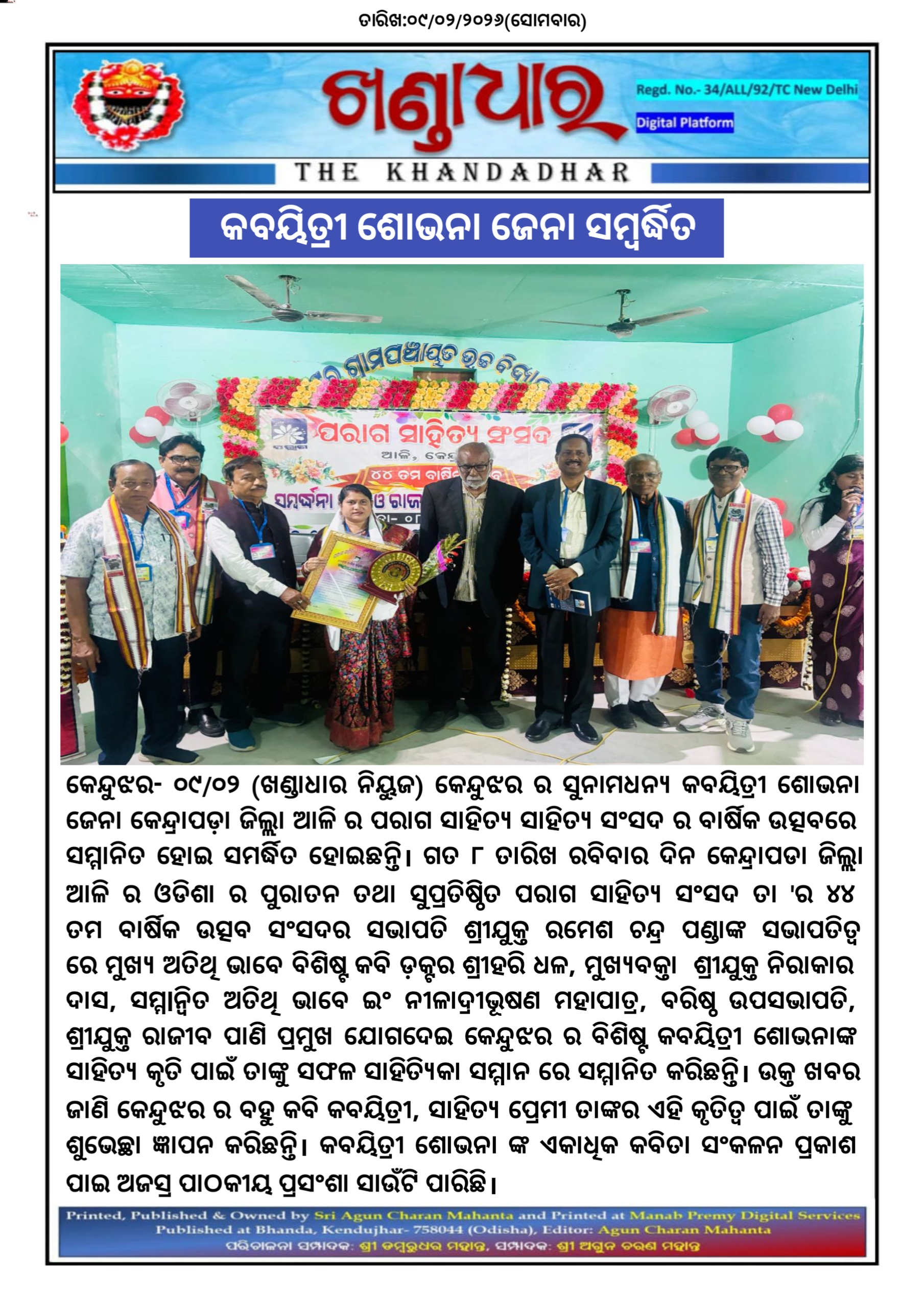 କେନ୍ଦୁଝର -୦୯/୦୨(ଖଣ୍ଡାଧାର ନିୟୁଜ) କେନ୍ଦୁଝର ର ସୁନାମଧନ୍ୟ କବୟିତ୍ରୀ ଶୋଭନା ଜେନା କେନ୍ଦ୍ରାପଡ଼ା ଜିଲ୍ଲା ଆଳି ର ପରାଗ ସାହିତ୍ୟ ସାହିତ୍ୟ ସଂସଦ ର ବାର୍ଷିକ ଉତ୍ସବରେ ସମ୍ମାନିତ ହୋଇ ସମର୍ଦ୍ଧିତ ହୋଇଛନ୍ତି l ଗତ ୮ ତାରିଖ ରବିବାର ଦିନ କେନ୍ଦ୍ରାପଡା ଜିଲ୍ଲା ଆଳି ର ଓଡିଶା ର ପୁରାତନ ତଥା ସୁପ୍ରତିଷ୍ଠିତ ପରାଗ ସାହିତ୍ୟ ସଂସଦ ତା 'ର ୪୪ ତମ ବାର୍ଷିକ ଉତ୍ସବ ସଂସଦର ସଭାପତି ଶ୍ରୀଯୁକ୍ତ ରମେଶ ଚନ୍ଦ୍ର ପଣ୍ଡାଙ୍କ ସଭାପତିତ୍ୱ ରେ ମୁଖ୍ୟ ଅତିଥି ଭାବେ ବିଶିଷ୍ଟ କବି ଡ଼କ୍ଟର ଶ୍ରୀହରି ଧଳ, ମୁଖ୍ୟବକ୍ତା ଶ୍ରୀଯୁକ୍ତ ନିରାକାର ଦାସ, ସମ୍ମlନ୍ୱିତ ଅତିଥି ଭାବେ
