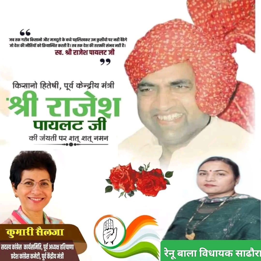 कपुरी :-हल्का सधौरा विधायक मैडम रेणु बाला जी नें जयंती पर नमन किया, "पूर्व केंद्रीय मंत्री और किसान मजदूरों के हितेषी स्वर्गीय श्री राजेश पायलट जी की जयंती पर उन्हें शत् शत् नमन" !