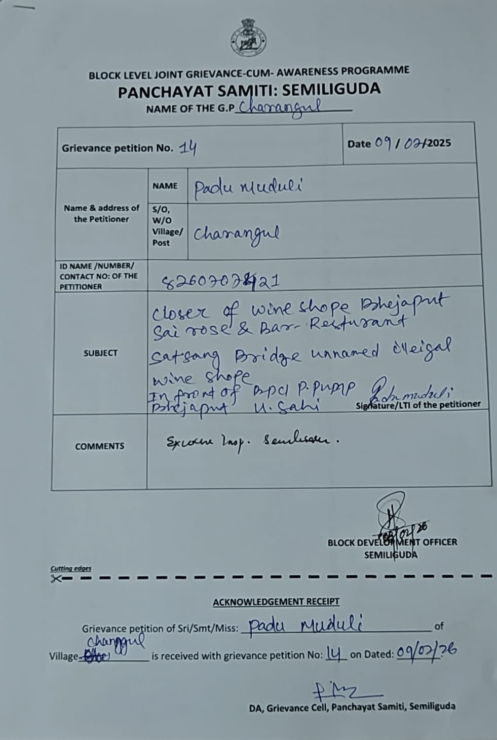 ଦାମନଯୋଡି:ସେମିଳିଗୁଡ଼ା ବ୍ଲକ ଅନ୍ତର୍ଗତ ଚାରାଙ୍ଗୁଲ ପଞ୍ଚାୟତ ଅଧିନ ଭେଜାପୁଟ ଅଞ୍ଚଳରେ ରହିଛି ଏକାଧିକ ଅବୈଧ ମଦ ଦୋକାନ । ସେଗୁଡିକୁ ବନ୍ଦ କରିବାକୁ ପଞ୍ଚାୟତର ସରପଞ୍ଚ ସମେତ ଶତାଧିକ ମହିଳା ଓ ପୁରୁଷଙ୍କ ସ୍ଵାକ୍ଷରିତ ଏକ ଦାବୀପତ୍ର ଶିବିର ଜରିଆରେ ଜିଲ୍ଲା ଅବକାରୀ ଅଧିକ୍ଷକଙ୍କ ନିକଟକୁ ପଠାଇଛନ୍ତି । ଅଭିଯୋଗ ପତ୍ର ମୁତାବକ ଭେଜାପୁଟ ଅଞ୍ଚଳରେ ଏକାଧିକ ଅବୈଧ ମଦ ଦୋକାନ ଥିବାରୁ ରାସ୍ତାରେ ଝିଅ ବୋହୁ ଚାଲିବାକୁ ଅସୁରକ୍ଷିତ ମଣୁଛନ୍ତି । ତା'ଛଡା ଏହି ରାସ୍ତା ଦେଇ ପ୍ରତିଦିନ ପିଲାମାନେ ପାଠ ପଢିବାକୁ ଯାଆସ କରନ୍ତି । ରାସ୍ତା ଉପରେ ଲୋକେ ମଦ ପିଉଥିବାରୁ ସେମାନଙ୍କ ଉପରେ ଏହାର କୁ-ପ୍ରଭାବ ପଡୁଥିବା ଦର୍ଶାଇଛନ୍ତି । ସବୁଠାରୁ ଗୁରୁତ୍ୱପୂର୍ଣ୍ଣ ବିଷୟ ଲୋକେ ମଦ ପିଇସାରି ଗ୍ଲାସ୍ ଓ ବୋତଲ ଗୁଡିକୁ ପାଖ ନାଳରେ ଭସାଇ ଦେଉଥିବାରୁ ସେଗୁଡିକ ଚାଷଜମିକୁ ହାନୀ ପହଞ୍ଚାଉଛି। ଫଳରେ ଚାଷକାମରେ ବାଧା ସୃଷ୍ଟି କରୁଛି । ଅନ୍ୟ ପକ୍ଷରେ ମଦ୍ୟପ ମାନେ କାଚ ବୋତଲ ଗୁଡ଼ିକୁ ରାସ୍ତା ଉପରେ ପକାଉ ଥିବାରୁ ଅନେକ ସମୟରେ ଯାନବାହାନ ଦୁର୍ଘଟଣା ଓ ପାଦ ଚଲା ଲୋକଙ୍କ ଗୋଡ଼ରେ ପଶି କ୍ଷତାକ୍ତ ହେଉଥିବାର ଦେଖିବାକୁ ମିଳୁଛି । ଏହିଭଳି ଏକାଧିକ କାରଣ ଦର୍ଶାଇ ଶିବିରରେ ଉପସ୍ଥିତ ଅଧିକାରୀଙ୍କୁ ଯୁବଗୋଷ୍ଠୀ ମାନେ ଏହି ଦାବିପତ୍ର ପ୍ରଦାନ କରିଥିଲେ । ରାମ ବିଶୋଇ, ଦୁର୍ଯ୍ୟୋଧନ ଗଉଡ଼, ପଦୁ ମୁଦୁଲି ସମେତ ଅନେକ ସଚେତନ ଯୁବଗୋଷ୍ଠୀ ଏହି ସମୟରେ ଉପସ୍ଥିତ ଥିଲେ ।
