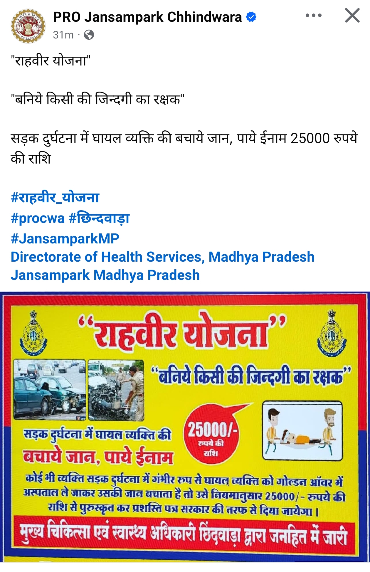 PRO जनसंपर्क छिंदवाड़ा ने जारी किया “राहवीर योजना” का जागरूकता पोस्टर