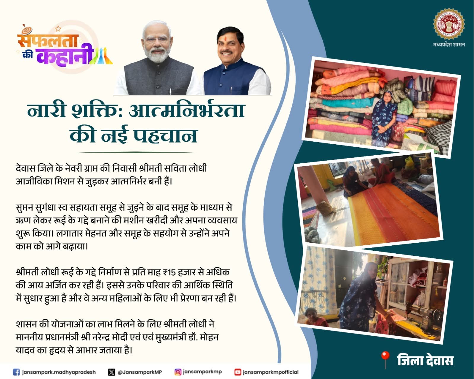 देवास जिले के नेवरी ग्राम की निवासी श्रीमती सविता लोधी आजीविका मिशन से जुड़कर आत्मनिर्भर बनी हैं।