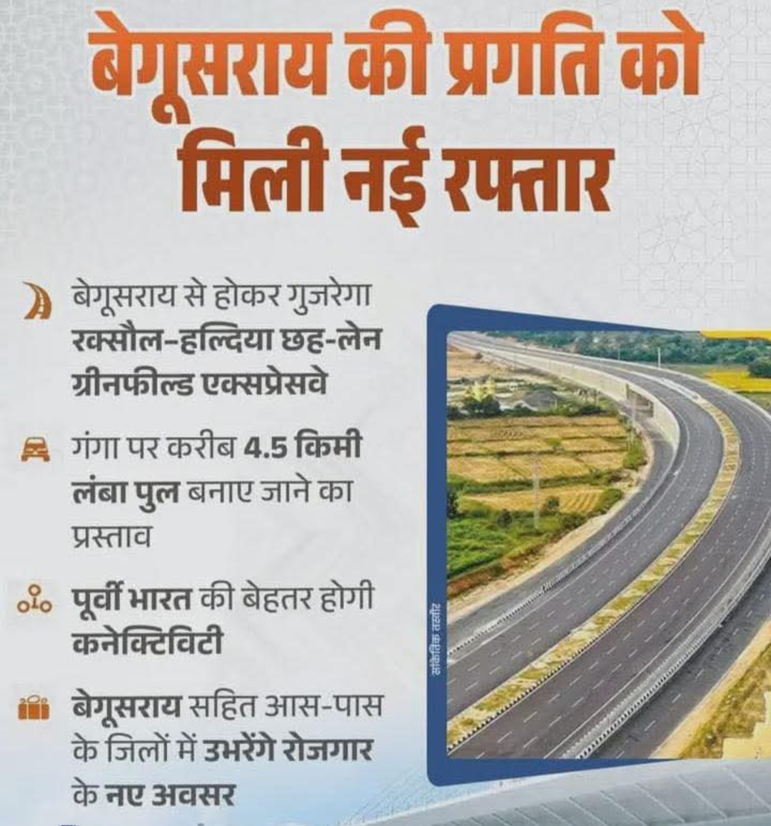 आदरणीय प्रधानमंत्री श्री Narendra Modi जी एवं माननीय मुख्यमंत्री श्री Nitish Kumar जी के नेतृत्व में बेगूसराय से होकर गुजरने वाला रक्सौल–हल्दिया छह-लेन ग्रीनफील्ड एक्सप्रेसवे बिहार के लिए विकास का नया कॉरिडोर बनेगा। यह परियोजना राज्य की कनेक्टिविटी को तेज़ और सशक्त करेगी, गंगा पर प्रस्तावित 4.5 किमी लंबे पुल से आवागमन को सुगम बनाएगी, लॉजिस्टिक्स व उद्योगों को बढ़ावा देगी और बेगूसराय सहित आसपास के क्षेत्रों में रोजगार के नए अवसर सृजित करेगी।