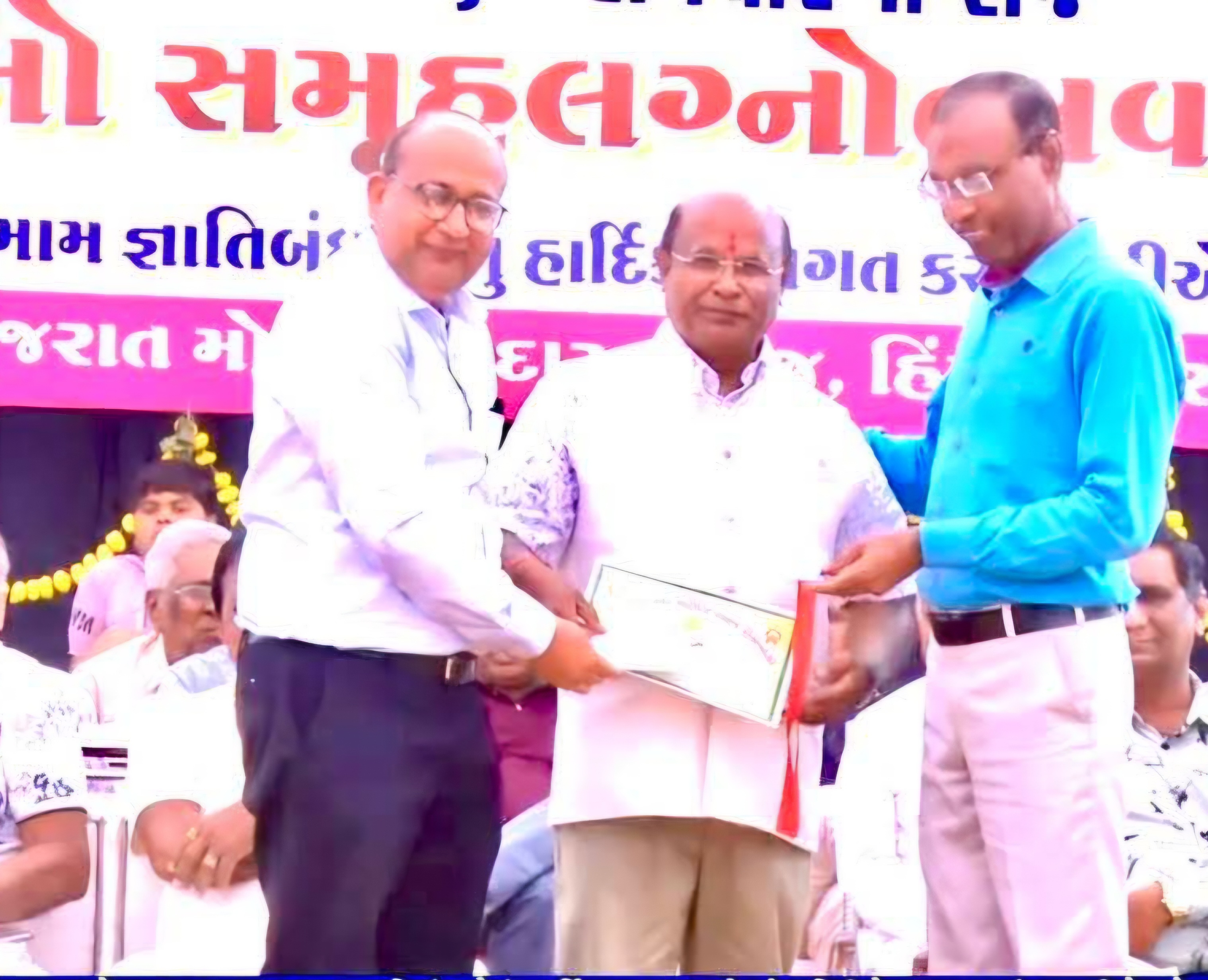 At Himmatnagar Date 07/02/2019 during the 11th group marriage, children of the society who came first in standard 10 and 12 were honored with silver medals