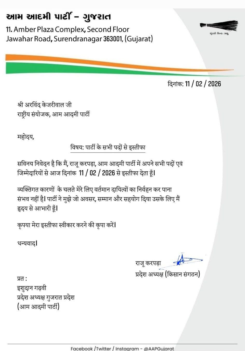 રાજુ કરપડાએ AAP પાર્ટીમાંથી આપ્યું રાજીનામુ…