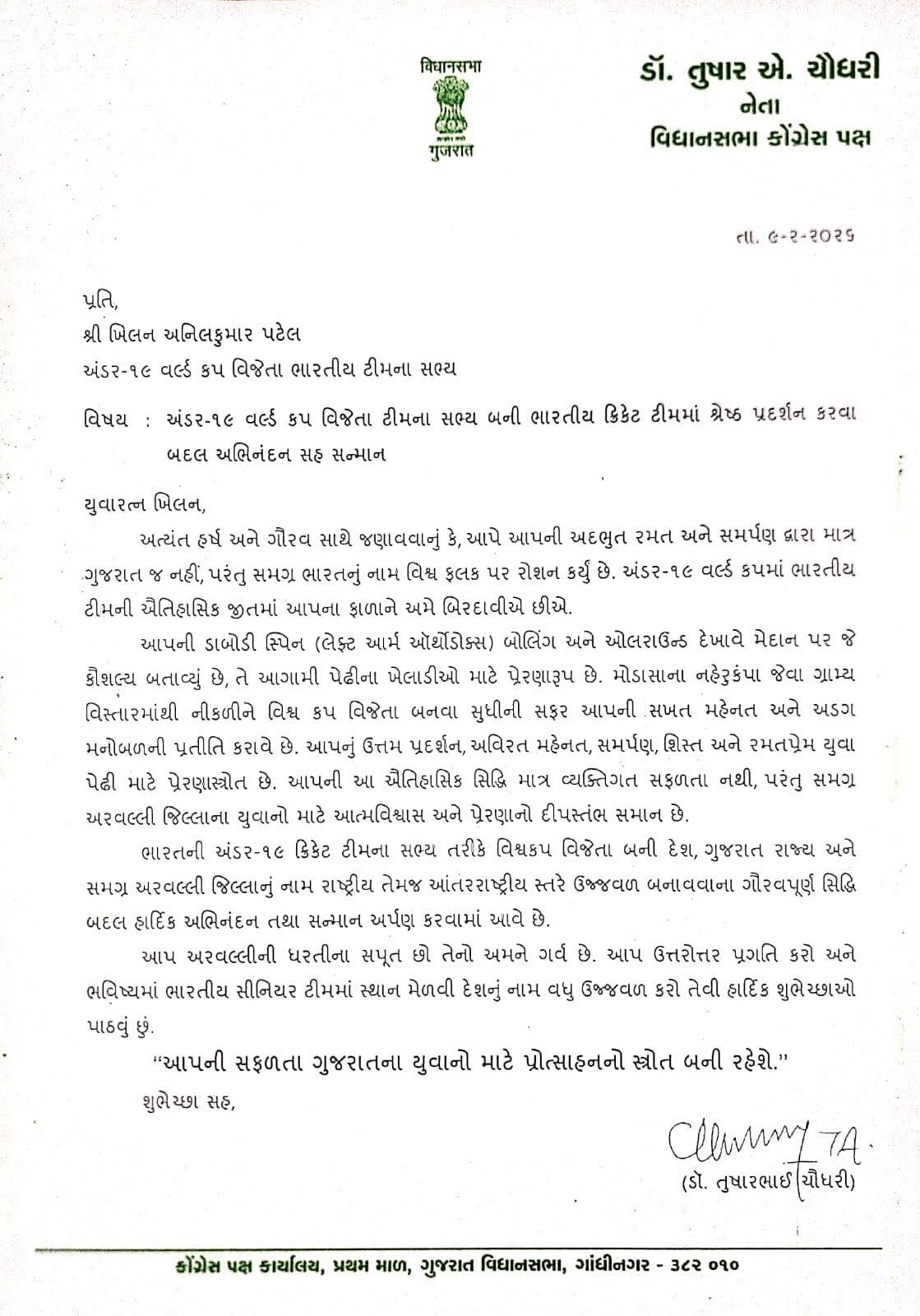 Today Modasa's Nehrukampa young under-19 world cup winner player Khilan Patel visited his Modasa residence, Gujarat Pradesh Congress Committee President Amitbhai Chavda and Vidhansabha Congress leader Dr. Abhinandan letter written by Tusharbhai Chaudhary and felicitated by Aravalli District Congress Committee.