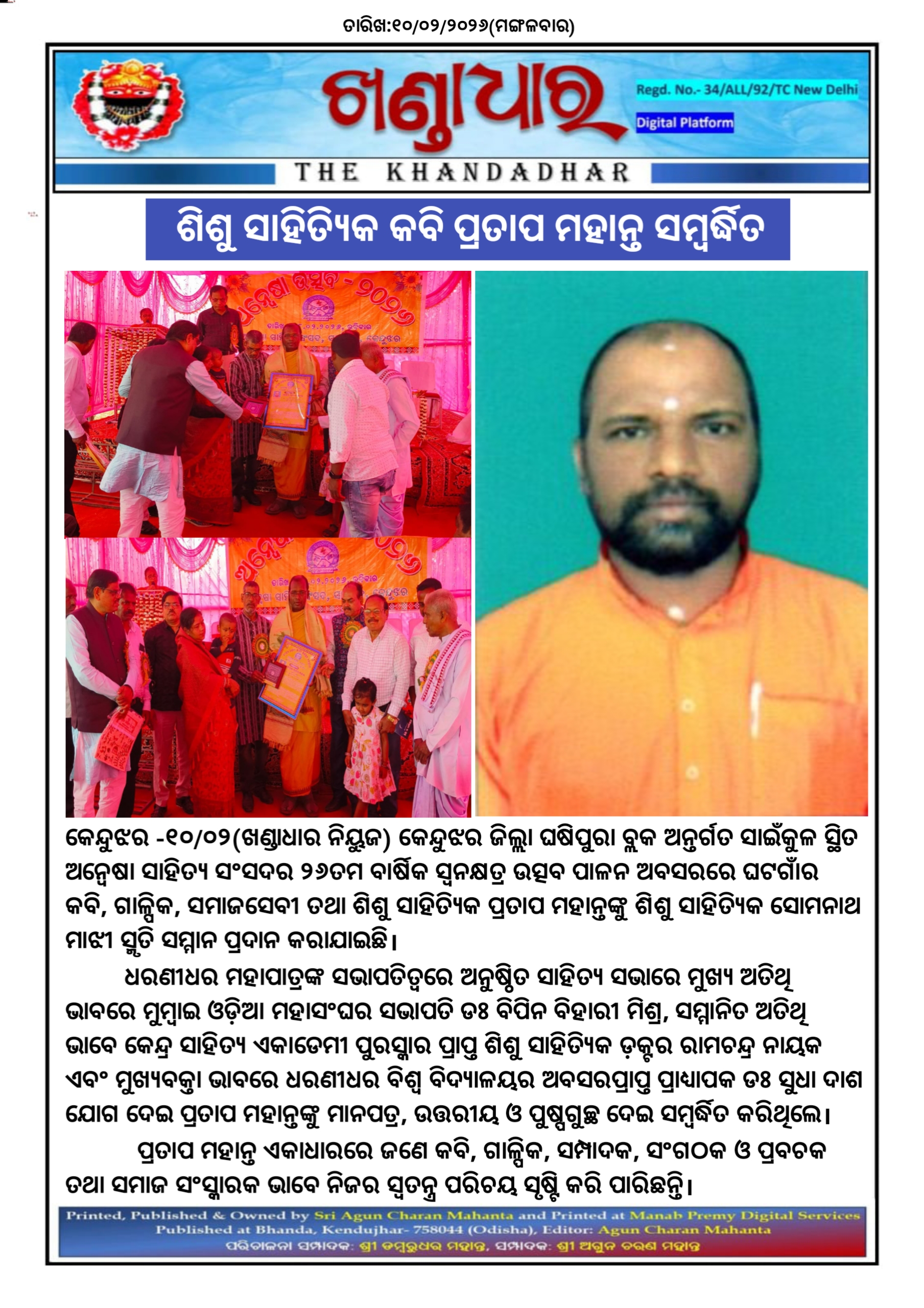 କେନ୍ଦୁଝର -୧୦/୦୨(ଖଣ୍ଡାଧାର ନିୟୁଜ) କେନ୍ଦୁଝର ଜିଲ୍ଲା ଘଷିପୁରା ବ୍ଲକ ଅନ୍ତର୍ଗତ ସାଇଁକୁଳ ସ୍ଥିତ ଅନ୍ଵେଷା ସାହିତ୍ୟ ସଂସଦର ୨୬ତମ ବାର୍ଷିକ ସ୍ଵନକ୍ଷତ୍ର ଉତ୍ସବ ପାଳନ ଅବସରରେ ଘଟଗାଁର କବି, ଗାଳ୍ପିକ , ସମାଜସେବୀ ତଥା ଶିଶୁ ସାହିତ୍ୟିକ ପ୍ରତାପ ମହାନ୍ତଙ୍କୁ ଶିଶୁ ସାହିତ୍ୟିକ ସୋମନାଥ ମାଝୀ ସ୍ମୃତି ସମ୍ମାନ ପ୍ରଦାନ କରାଯାଇଛି l