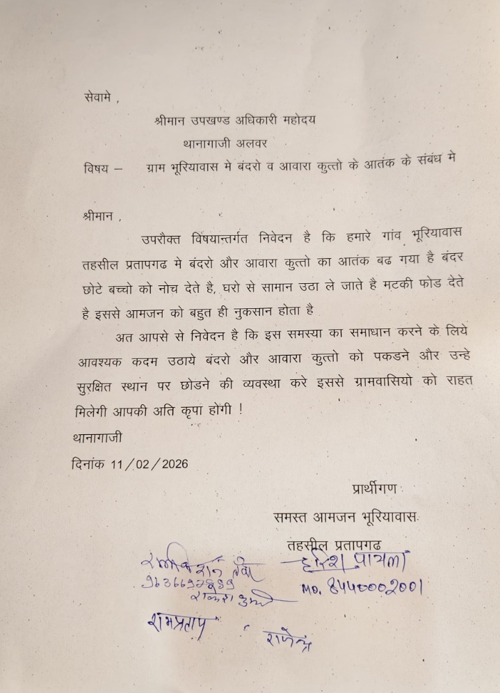 थानागाजी (अलवर)। भूरियावास गांव में बंदरों और अवारा कुत्तों के आतंक से परेशान ग्रामीणों ने उपखंड अधिकारी को ज्ञापन सौंपा। सामाजिक कार्यकर्ता हरीश पायला के नेतृत्व में ग्रामीणों ने उपखंड अधिकारी से मुलाकात कर समस्या से अवगत कराया।