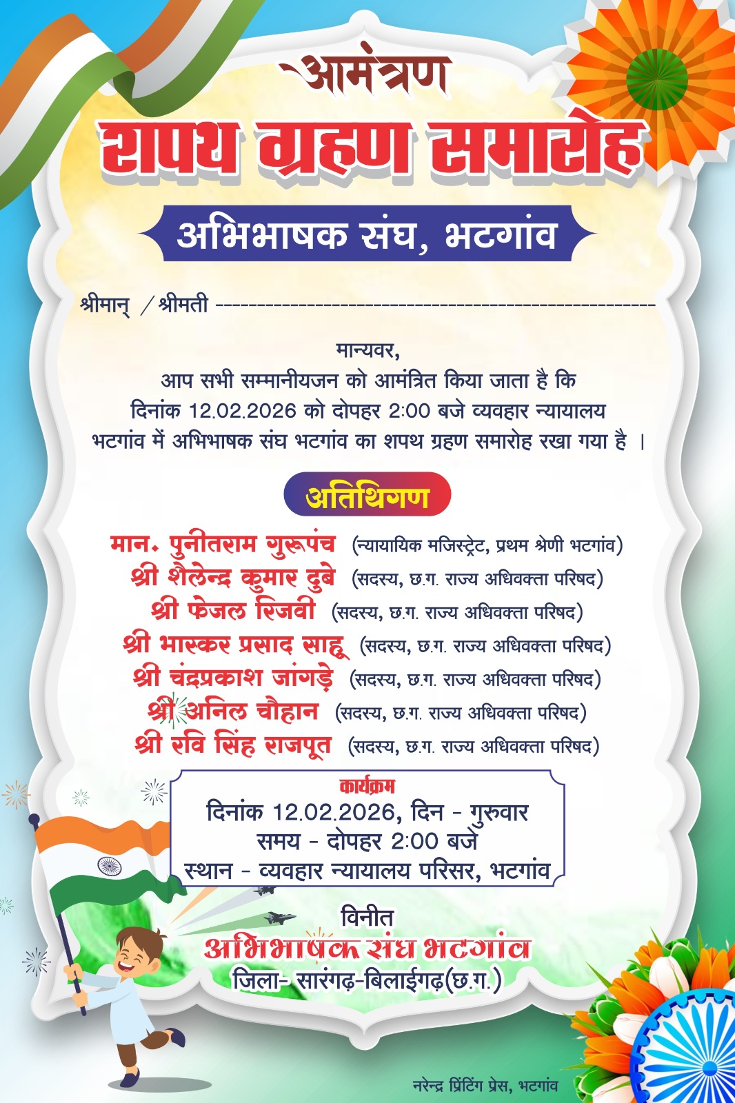 अभिभाषक संघ भटगांव के नवनिर्वाचित पदाधिकारीयों का शपथ ग्रहण समारोह का आयोजन 12 फ़रवरी को