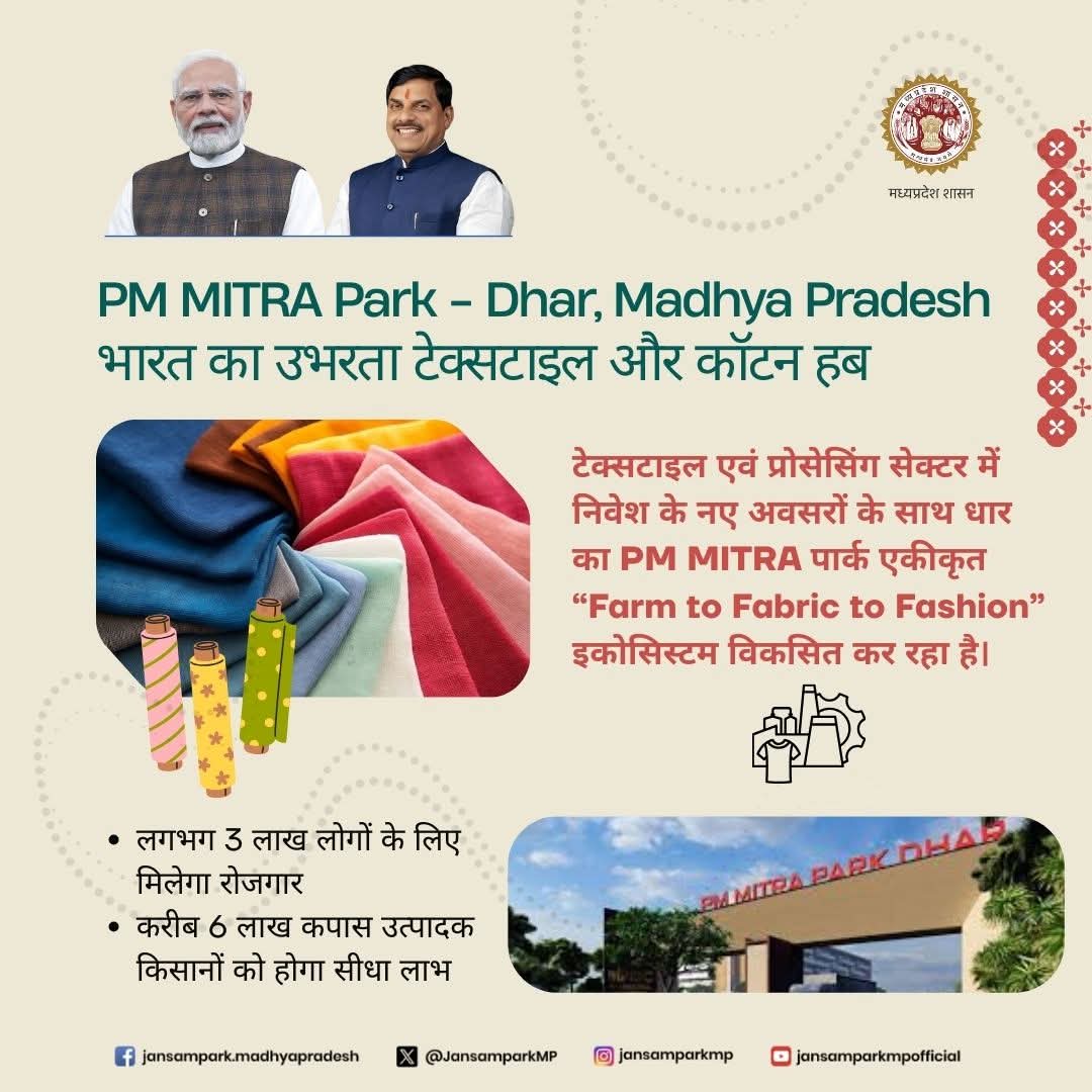 टेक्सटाइल एवं प्रोसेसिंग सेक्टर में निवेश के नए अवसरों के साथ धार का PM MITRA पार्क एकीकृत “Farm to Fabric to Fashion” इकोसिस्टम विकसित कर रहा है।