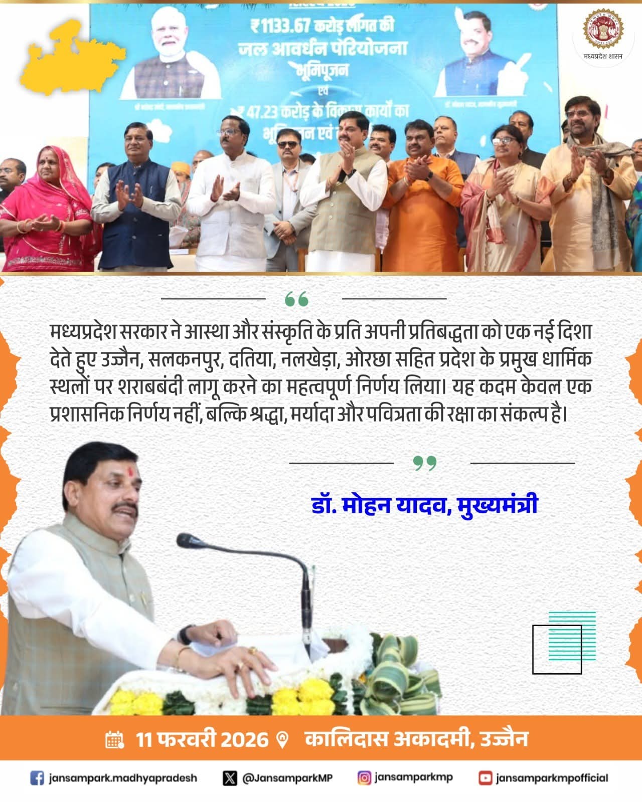 मध्यप्रदेश सरकार ने आस्था और संस्कृति के प्रति अपनी प्रतिबद्धता को एक नई दिशा देते हुए उज्जैन, सलकनपुर, दतिया, नलखेड़ा, ओरछा सहित प्रदेश के प्रमुख धार्मिक स्थलों पर शराबबंदी लागू करने का महत्वपूर्ण निर्णय लिया। यह कदम केवल एक प्रशासनिक निर्णय नहीं, बल्कि श्रद्धा, मर्यादा और पवित्रता की रक्षा का संकल्प है।