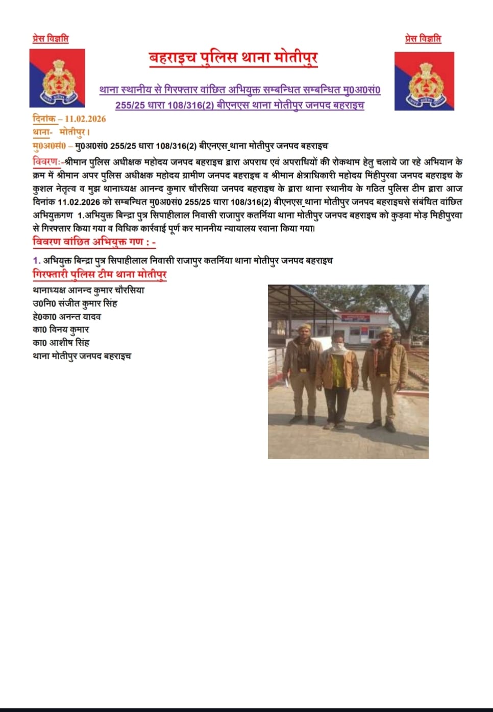अभियुक्त बिन्द्रा पुत्र सिपाहीलाल निवासी राजापुर कतर्निया थाना मोतीपुर बहराइच संबंधित मु0अ0सं0 255/2025 धारा 108/316(2) बीएनएस गिरफ्तार