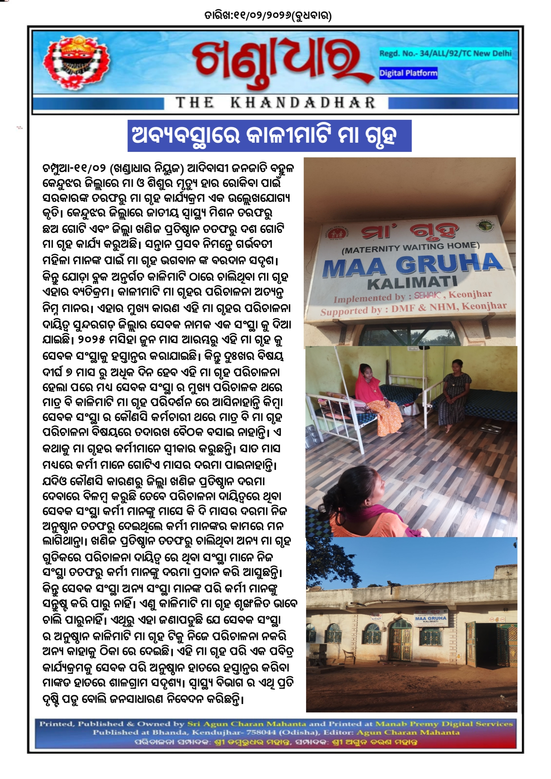 ଚମ୍ପୁଆ -୧୧/୦୨(ଖଣ୍ଡାଧାର ନିୟୁଜ) ଆଦିବାସୀ ଜନଜାତି ବହୁଳ କେନ୍ଦୁଝର ଜିଲ୍ଲାରେ ମା ଓ ଶିଶୁର ମୃତ୍ୟୁ ହାର ରୋକିବା ପାଇଁ ସରକାରଙ୍କ ତରଫରୁ ମା ଗୃହ କାର୍ଯ୍ୟକ୍ରମ ଏକ ଉଲ୍ଲେଖଯୋଗ୍ୟ କୃତି । କେନ୍ଦୁଝର ଜିଲ୍ଲାରେ ଜାତୀୟ ସ୍ୱାସ୍ଥ୍ୟ ମିଶନ ତରଫରୁ ଛଅ ଗୋଟି ଏବଂ ଜିଲ୍ଲା ଖଣିଜ ପ୍ରତିଷ୍ଠାନ ତତଫରୁ ଦଶ ଗୋଟି ମା ଗୃହ କାର୍ଯ୍ୟ କରୁଅଛି। ସନ୍ତାନ ପ୍ରସବ ନିମନ୍ତେ ଗର୍ଭବତୀ ମହିଳା ମାନଙ୍କ ପାଇଁ ମା ଗୃହ ଭଗବାନ ଙ୍କ ବରଦାନ ସଦୃଶ । କିନ୍ତୁ ଯୋଡ଼ା ବ୍ଳକ ଅନ୍ତର୍ଗତ କାଳିମାଟି ଠାରେ ଚାଲିଥିବା ମା ଗୃହ ଏହାର ବ୍ୟତିକ୍ରମ । କାଳୀମାଟି ମା ଗୃହର ପରିଚାଳନା ଅତ୍ୟନ୍ତ ନିମ୍ନ ମାନର । ଏହାର ମୁଖ୍ୟ କାରଣ ଏହି ମା ଗୃହର ପରିଚାଳନା ଦାୟିତ୍ଵ ସୁନ୍ଦରଗଡ଼ ଜିଲ୍ଲାର ସେବକ ନାମକ ଏକ ସଂସ୍ଥା କୁ ଦିଆ ଯାଇଛି । ୨୦୨୫ ମସିହା ଜୁନ ମାସ ଆରମ୍ଭରୁ ଏହି ମା ଗୃହ କୁ ସେବକ ସଂସ୍ଥାକୁ ହସ୍ତାନ୍ତର କରାଯାଇଛି। କିନ୍ତୁ ଦୁଃଖର ବିଷୟ ଦୀର୍ଘ ୭ ମାସ ରୁ ଅଧିକ ଦିନ ହେବ ଏହି ମା ଗୃହ ପରିଚାଳନା ହେଲା ପରେ ମଧ୍ୟ ସେବକ ସଂସ୍ଥା ର ମୁଖ୍ୟ ପରିଚାଳକ ଥରେ ମାତ୍ର ବି କାଳିମାଟି ମା ଗୃହ ପରିଦର୍ଶନ ରେ ଆସିନାହାନ୍ତି କିମ୍ବା ସେବକ ସଂସ୍ଥା ର କୌଣସି କର୍ମଚାରୀ ଥରେ ମାତ୍ର ବି ମା ଗୃହ ପରିଚାଳନା ବିଷୟରେ ତଦାରଖ ବୈଠକ ବସାଇ ନାହାନ୍ତି। ଏ କଥାକୁ ମା ଗୃହର କର୍ମୀମାନେ ସ୍ବୀକାର କରୁଛନ୍ତି। ସାତ ମାସ ମଧ୍ୟରେ କର୍ମୀ ମାନେ ଗୋଟିଏ ମାସର ଦରମା ପାଇନାହାନ୍ତି। ଯଦିଓ କୌଣସି କାରଣରୁ ଜିଲ୍ଲା ଖଣିଜ ପ୍ରତିଷ୍ଠାନ ଦରମା ଦେବାରେ ବିଳମ୍ବ କରୁଛି ତେବେ ପରିଚାଳନା ଦାୟିତ୍ଵରେ ଥିବା ସେବକ ସଂସ୍ଥା କର୍ମୀ ମାନଙ୍କୁ ମାସେ କି ଦି ମାସର ଦରମା ନିଜ ଅନୁଷ୍ଠାନ ତତଫରୁ ଦେଇଥିଲେ କର୍ମୀ ମାନଙ୍କର କାମରେ ମନ ଲାଗିଥାନ୍ତା । ଖଣିଜ ପ୍ରତିଷ୍ଠାନ ତତଫରୁ ଚାଲିଥିବା ଅନ୍ୟ ମା ଗୃହ ଗୁଡିକରେ ପରିଚାଳନା ଦାୟିତ୍ଵ ରେ ଥିବା ସଂସ୍ଥା ମାନେ ନିଜ ସଂସ୍ଥା ତତଫରୁ କର୍ମୀ ମାନଙ୍କୁ ଦରମା ପ୍ରଦାନ କରି ଆସୁଛନ୍ତି। କିନ୍ତୁ ସେବକ ସଂସ୍ଥା ଅନ୍ୟ ସଂସ୍ଥା ମାନଙ୍କ ପରି କର୍ମୀ ମାନଙ୍କୁ ସନ୍ତୁଷ୍ଟ କରି ପାରୁ ନାହିଁ। ଏଣୁ କାଳିମାଟି ମା ଗୃହ ଶୃଙ୍ଖଳିତ ଭାବେ ଚାଲି ପାରୁନାହିଁ। ଏଥିରୁ ଏହା ଜଣାପଡୁଛି ଯେ ସେବକ ସଂସ୍ଥା ର ଅନୁଷ୍ଠାନ କାଳିମାଟି ମା ଗୃହ ଟିକୁ ନିଜେ ପରିଚାଳନା ନକରି ଅନ୍ୟ କାହାକୁ ଠିକା ରେ ଦେଇଛି । ଏହି ମା ଗୃହ ପରି ଏକ ପବିତ୍ର କାର୍ଯ୍ୟକ୍ରମକୁ ସେବକ ପରି ଅନୁଷ୍ଠାନ ହାତରେ ହସ୍ତାନ୍ତର କରିବା ମାଙ୍କଡ ହାତରେ ଶାଳଗ୍ରାମ ସଦୃଶ୍ୟ। ସ୍ୱାସ୍ଥ୍ୟ ବିଭାଗ ର ଏଥି ପ୍ରତି ଦୃଷ୍ଟି ପଡୁ ବୋଲି ଜନସାଧାରଣ ନିବେଦନ କରିଛନ୍ତି।