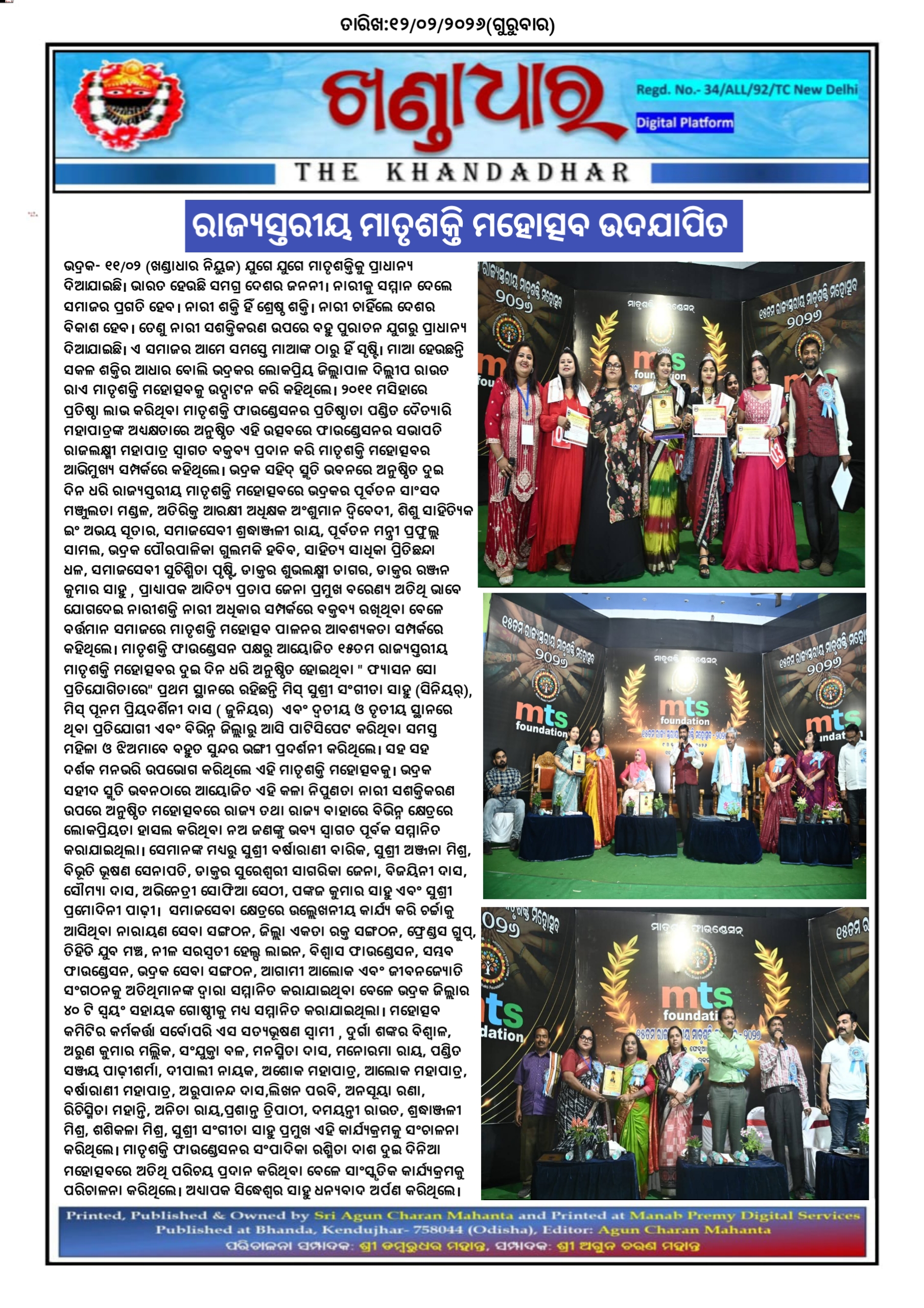 ଭଦ୍ରକ - ୧୧/୦୨(ଖଣ୍ଡାଧାର ନିୟୁଜ) ଯୁଗେ ଯୁଗେ ମାତୃଶକ୍ତିକୁ ପ୍ରାଧାନ୍ୟ ଦିଆଯାଇଛି। ଭାରତ ହେଉଛି ସମଗ୍ର ଦେଶର ଜନନୀ । ନାରୀକୁ ସମ୍ମାନ ଦେଲେ ସମାଜର ପ୍ରଗତି ହେବ। ନାରୀ ଶକ୍ତି ହିଁ ଶ୍ରେଷ୍ଠ ଶକ୍ତି। ନାରୀ ଚାହିଁଲେ ଦେଶର ବିକାଶ ହେବ। ତେଣୁ ନାରୀ ସଶକ୍ତିକରଣ ଉପରେ ବହୁ ପୁରାତନ ଯୁଗରୁ ପ୍ରାଧାନ୍ୟ ଦିଆଯାଇଛି । ଏ ସମାଜର ଆମେ ସମସ୍ତେ ମାଆଙ୍କ ଠାରୁ ହିଁ ସୃଷ୍ଟି। ମାଆ ହେଉଛନ୍ତି ସକଳ ଶକ୍ତିର ଆଧାର ବୋଲି ଭଦ୍ରକର ଲୋକପ୍ରିୟ ଜିଲ୍ଲାପାଳ ଦିଲ୍ଲୀପ ରାଉତ ରାଏ ମାତୃଶକ୍ତି ମହୋତ୍ସବକୁ ଉଦ୍ଘାଟନ କରି କହିଥିଲେ। ୨୦୧୧ ମସିହାରେ ପ୍ରତିଷ୍ଠା ଲାଭ କରିଥିବା ମାତୃଶକ୍ତି ଫାଉଣ୍ଡେସନର ପ୍ରତିଷ୍ଠାତା ପଣ୍ଡିତ ଦୈତ୍ୟାରି ମହାପାତ୍ରଙ୍କ ଅଧ୍ୟକ୍ଷତାରେ ଅନୁଷ୍ଠିତ ଏହି ଉତ୍ସବରେ ଫାଉଣ୍ଡେସନର ସଭାପତି ରାଜଲକ୍ଷ୍ମୀ ମହାପାତ୍ର ସ୍ଵାଗତ ବକ୍ତବ୍ୟ ପ୍ରଦାନ କରି ମାତୃଶକ୍ତି ମହୋତ୍ସବର ଆଭିମୁଖ୍ୟ ସମ୍ପର୍କରେ କହିଥିଲେ। ଭଦ୍ରକ ସହିଦ୍ ସ୍ମୃତି ଭବନରେ ଅନୁଷ୍ଠିତ ଦୁଇ ଦିନ ଧରି ରାଜ୍ୟସ୍ତରୀୟ ମାତୃଶକ୍ତି ମହୋତ୍ସବରେ ଭଦ୍ରକର ପୂର୍ବତନ ସାଂସଦ ମଞ୍ଜୁଲତା ମଣ୍ଡଳ, ଅତିରିକ୍ତ ଆରକ୍ଷୀ ଅଧିକ୍ଷକ ଅଂଶୁମାନ ଦ୍ବିବେଦୀ, ଶିଶୁ ସାହିତ୍ୟିକ ଇଂ ଅଭୟ ସୂତାର, ସମାଜସେବୀ ଶ୍ରଦ୍ଧାଞ୍ଜଳୀ ରାୟ, ପୂର୍ବତନ ମନ୍ତ୍ରୀ ପ୍ରଫୁଲ୍ଲ ସାମଲ, ଭଦ୍ରକ ପୌରପାଳିକା ଗୁଲମକି ହବିବ, ସାହିତ୍ୟ ସାଧିକା ପ୍ରିତିଛନ୍ଦା ଧଳ, ସମାଜସେବୀ ସୁଚିଶ୍ମିତା ପୃଷ୍ଟି, ଡାକ୍ତର ଶୁଭଲକ୍ଷ୍ମୀ ଡାଗର, ଡାକ୍ତର ରଞ୍ଜନ କୁମାର ସାହୁ , ପ୍ରାଧ୍ୟାପକ ଆଦିତ୍ୟ ପ୍ରତାପ ଜେନା ପ୍ରମୁଖ ବରେଣ୍ୟ ଅତିଥି ଭାବେ ଯୋଗଦେଇ ନାରୀଶକ୍ତି ନାରୀ ଅଧିକାର ସମ୍ପର୍କରେ ବକ୍ତବ୍ୟ ରଖିଥିବା ବେଳେ ବର୍ତ୍ତମାନ ସମାଜରେ ମାତୃଶକ୍ତି ମହୋତ୍ସବ ପାଳନର ଆବଶ୍ୟକତା ସମ୍ପର୍କରେ କହିଥିଲେ। ମାତୃଶକ୍ତି ଫାଉଣ୍ଡେସନ ପକ୍ଷରୁ ଆୟୋଜିତ ୧୫ତମ ରାଜ୍ୟସ୍ତରୀୟ ମାତୃଶକ୍ତି ମହୋତ୍ସବର ଦୁଇ ଦିନ ଧରି ଅନୁଷ୍ଠିତ ହୋଇଥିବା " ଫ୍ୟାସନ ସୋ ପ୍ରତିଯୋଗିତାରେ" ପ୍ରଥମ ସ୍ଥାନରେ ରହିଛନ୍ତି ମିସ୍ ସୁଶ୍ରୀ ସଂଗୀତା ସାହୁ (ସିନିୟର୍), ମିସ୍ ପୂନମ ପ୍ରିୟଦର୍ଶିନୀ ଦାସ ( ଜୁନିୟର) ଏବଂ ଦ୍ୱତୀୟ ଓ ତୃତୀୟ ସ୍ଥାନରେ ଥିବା ପ୍ରତିଯୋଗୀ ଏବଂ ବିଭିନ୍ନ ଜିଲ୍ଲାରୁ ଆସି ପାଟିସିପେଟ କରିଥିବା ସମସ୍ତ ମହିଳା ଓ ଝିଅମାବେ ବହୁତ ସୁନ୍ଦର ଭଙ୍ଗୀ ପ୍ରଦର୍ଶନୀ କରିଥିଲେ । ସହ ସହ ଦର୍ଶକ ମନଭରି ଉପଭୋଗ କରିଥିଲେ ଏହି ମାତୃଶକ୍ତି ମହୋତ୍ସବକୁ। ଭଦ୍ରକ ସହୀଦ ସ୍ମୃତି ଭବନଠାରେ ଆୟୋଜିତ ଏହି କଳା ନିପୁଣତା ନାରୀ ସଶକ୍ତିକରଣ ଉପରେ ଅନୁଷ୍ଠିତ ମହୋତ୍ସବରେ ରାଜ୍ୟ ତଥା ରାଜ୍ୟ ବାହାରେ ବିଭିନ୍ନ କ୍ଷେତ୍ରରେ ଲୋକପ୍ରିୟତା ହାସଲ କରିଥିବା ନଅ ଜଣଙ୍କୁ ଭବ୍ୟ ସ୍ଵାଗତ ପୂର୍ବକ ସମ୍ମାନିତ କରାଯାଇଥିଲା। ସେମାନଙ୍କ ମଧ୍ୟରୁ ସୁଶ୍ରୀ ବର୍ଷାରାଣୀ ବାରିକ, ସୁଶ୍ରୀ ଅଞ୍ଜନା ମିଶ୍ର, ବିଭୂତି ଭୂଷଣ ସେନାପତି, ଡାକ୍ତର ସୁରେଶ୍ଵରୀ ସାଗରିକା ଜେନା, ବିଜୟିନୀ ଦାସ, ସୌମ୍ୟା ଦାସ, ଅଭିନେତ୍ରୀ ସୋଫିଆ ସେଠୀ, ପଙ୍କଜ କୁମାର ସାହୁ ଏବଂ ସୁଶ୍ରୀ ପ୍ରମୋଦିନୀ ପାଢ଼ୀ। ସମାଜସେବା କ୍ଷେତ୍ରରେ ଉଲ୍ଲେଖନୀୟ କାର୍ଯ୍ୟ କରି ଚର୍ଚ୍ଚାକୁ ଆସିଥିବା ନାରାୟଣ ସେବା ସଙ୍ଗଠନ, ଜିଲ୍ଲା ଏକତା ରକ୍ତ ସଙ୍ଗଠନ, ଫ୍ରେଣ୍ଡସ ଗ୍ରୁପ୍, ତିହିଡି ଯୁବ ମଞ୍ଚ, ନୀଳ ସରସ୍ଵତୀ ହେଲ୍ପ ଲାଇନ, ବିଶ୍ୱାସ ଫାଉଣ
