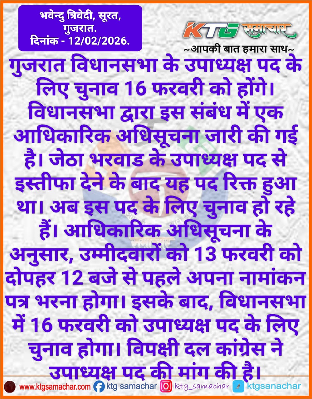 गुजरात विधानसभा के उपाध्यक्ष पद के लिए चुनाव 16 फरवरी को होगे।