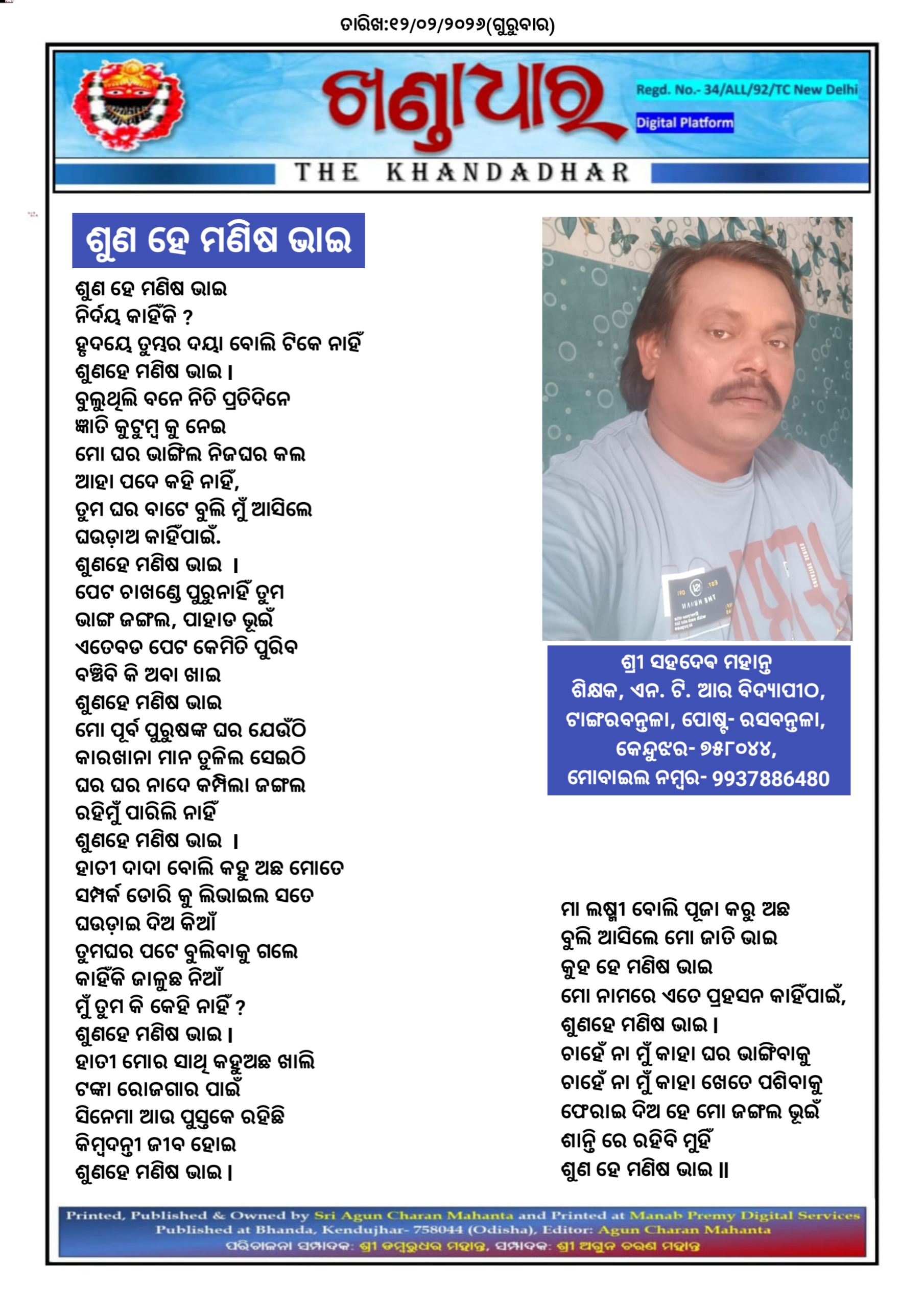 ଶୁଣ ହେ ମଣିଷ ଭାଇ - ସହଦେବ ମହାନ୍ତ ଙ୍କ ଦ୍ଵାରା ରଚିତ କବିତା।