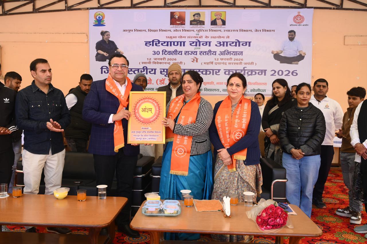 आज भगत फूल सिंह महिला विश्वविद्यालय के कन्या गुरुकुल वरिष्ठ माध्यमिक विद्यालय, खानपुर कलां में आयुष विभाग, हरियाणा एवं हरियाणा योग आयोग के संयुक्त तत्वावधान में 12 जनवरी से 12 फरवरी तक आयोजित सूर्य नमस्कार अभियान के जिला स्तरीय समापन समारोह का आयोजन किया गया।