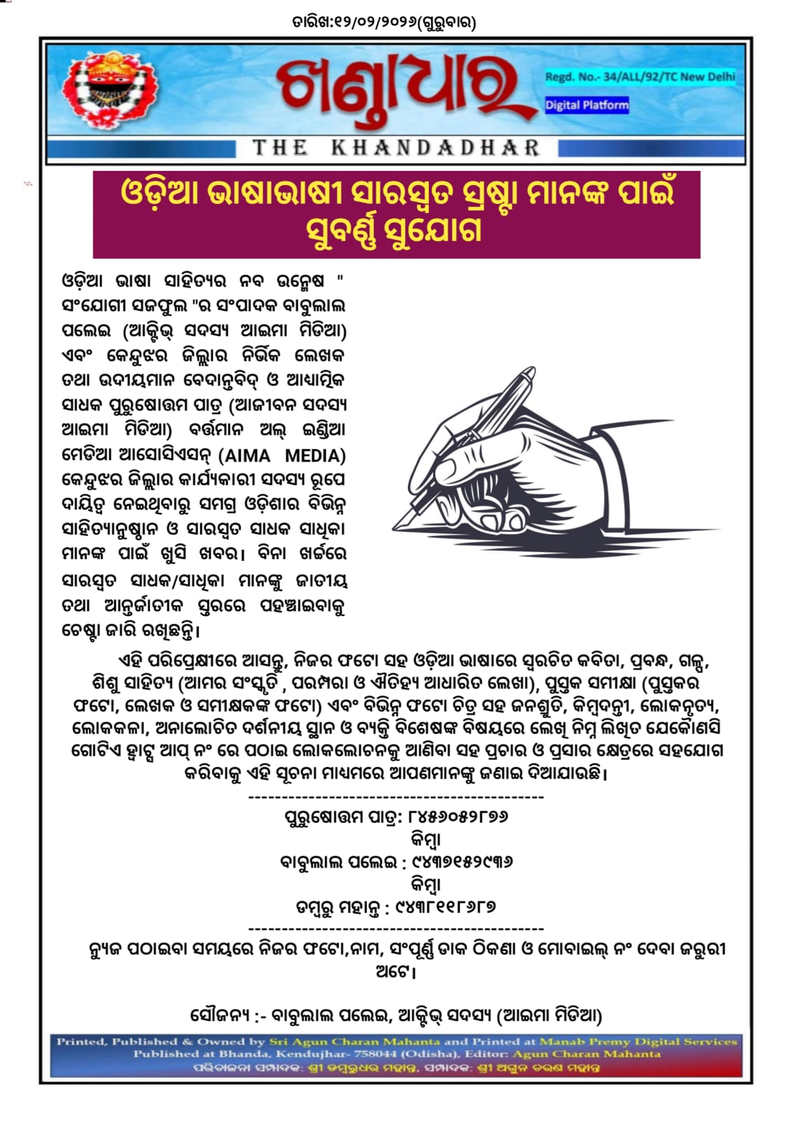 ଓଡ଼ିଆ ଭାଷା ସାହିତ୍ୟର ନବ ଉନ୍ମେଷ " ସଂଯୋଗୀ ସଜଫୁଲ "ର ସଂପାଦକ ବାବୁଲାଲ ପଲେଇ (ଆକ୍ଟିଭ୍ ସଦସ୍ୟ ଆଇମା ମିଡିଆ) ଏବଂ କେନ୍ଦୁଝର ଜିଲ୍ଲାର ନିର୍ଭିକ ଲେଖକ ତଥା ଉଦୀୟମାନ ବେଦାନ୍ତବିଦ୍ ଓ ଆଧ୍ଯାତ୍ମିକ ସାଧକ ପୁରୁଷୋତ୍ତମ ପାତ୍ର (ଆଜୀବନ ସଦସ୍ୟ ଆଇମା ମିଡିଆ) ବର୍ତ୍ତମାନ ଅଲ୍ ଇଣ୍ଡିଆ ମେଡିଆ ଆସୋସିଏସନ୍ (AIMA MEDIA) କେନ୍ଦୁଝର ଜିଲ୍ଲାର କାର୍ଯ୍ୟକାରୀ ସଦସ୍ୟ ରୂପେ ଦାୟିତ୍ବ ନେଇଥିବାରୁ ସମଗ୍ର ଓଡ଼ିଶାର ବିଭିନ୍ନ ସାହିତ୍ଯାନୁଷ୍ଠାନ ଓ ସାରସ୍ବତ ସାଧକ ସାଧିକା ମାନଙ୍କ ପାଇଁ ଖୁସି ଖବର। ବିନା ଖର୍ଚ୍ଚରେ ସାରସ୍ବତ ସାଧକ/ସାଧିକା ମାନଙ୍କୁ ଜାତୀୟ ତଥା ଆନ୍ତର୍ଜାତୀକ ସ୍ତରରେ ପହଞ୍ଚାଇବାକୁ ଚେଷ୍ଟା ଜାରି ରଖିଛନ୍ତି।
