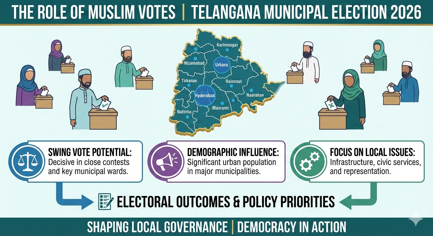 తెలంగాణ రాష్ట్రంలో 2026 మున్సిపల్ ఎన్నికలు రాష్ట్ర రాజకీయాల్లో కీలక మలుపు తిప్పే అవకాశమున్న ఎన్నికలుగా భావించబడుతున్నాయి. పట్టణ స్థాయిలో జరిగే ఈ ఎన్నికల్లో మౌలిక సదుపాయాలు, అభివృద్ధి, పారదర్శక పాలన, సంక్షేమ పథకాలు ప్రధాన అజెండాలుగా నిలుస్తున్నాయి. అయితే ఈ ఎన్నికల్లో మరో ముఖ్య అంశం ముస్లిం ఓటర్ల ప్రభావం.