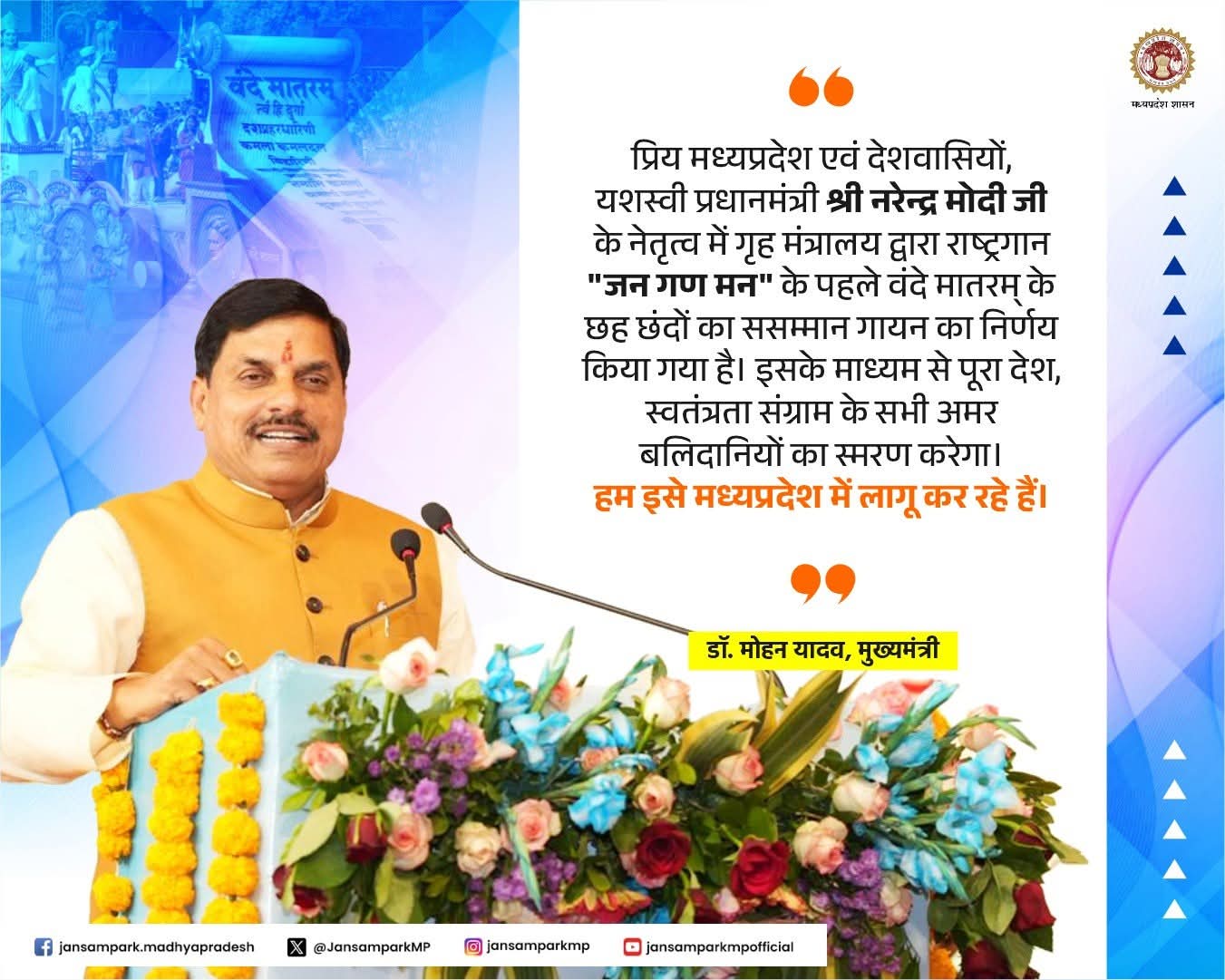 यशस्वी प्रधानमंत्री श्री Narendra Modi जी के नेतृत्व में गृह मंत्रालय द्वारा राष्ट्रगान "जन गण मन" के पहले वंदे मातरम् के छह छंदों का ससम्मान गायन का निर्णय किया गया है। इसके माध्यम से पूरा देश, स्वतंत्रता संग्राम के सभी अमर बलिदानियों का स्मरण करेगा।