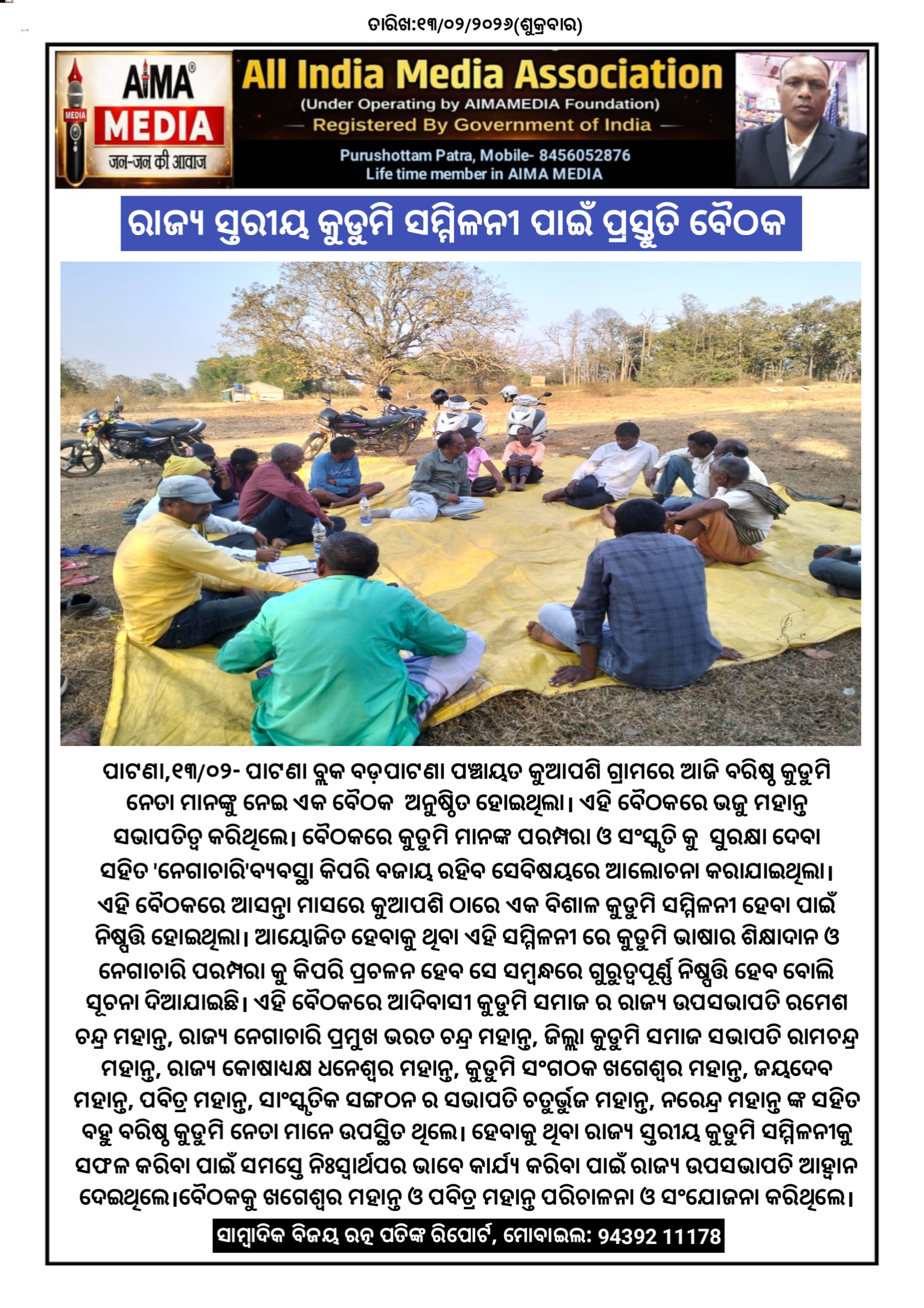 ରାଜ୍ୟ ସ୍ତରୀୟ କୁଡୁମି ସମ୍ମିଳନୀ ପାଇଁ ପ୍ରସ୍ତୁତି ବୈଠକ।