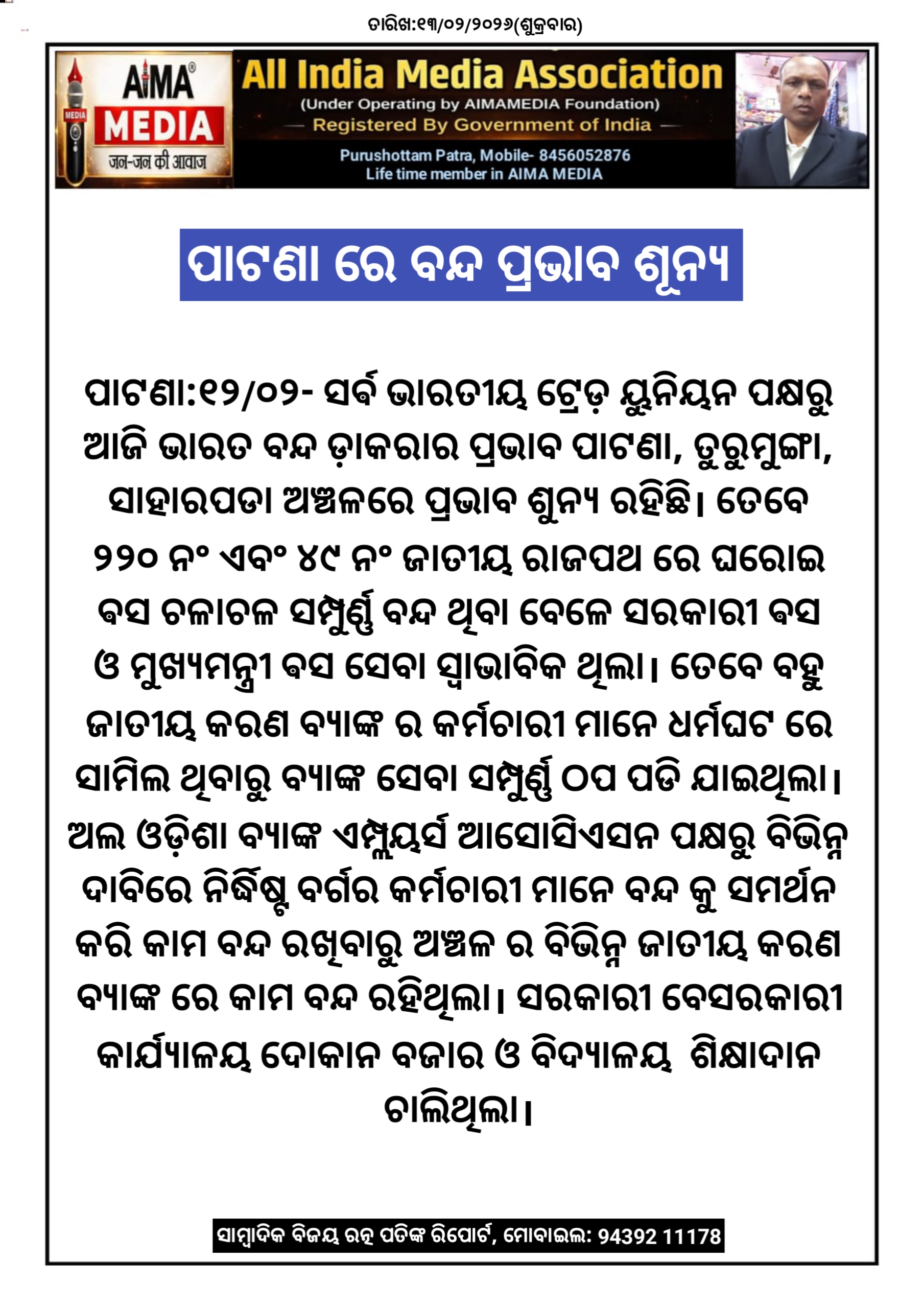 ପାଟଣା:୧୨/୦୨- ସର୍ଵ ଭାରତୀୟ ଟ୍ରେଡ଼ ୟୁନିୟନ ପକ୍ଷରୁ ଆଜି ଭାରତ ବନ୍ଦ ଡ଼ାକରାର ପ୍ରଭାବ ପାଟଣା, ତୁରୁମୁଙ୍ଗା, ସାହାରପଡା ଅଞ୍ଚଳରେ ପ୍ରଭାବ ଶୁନ୍ୟ ରହିଛି। ତେବେ 220 ନଂ ଏବଂ 49 ନଂ ଜାତୀୟ ରାଜପଥ ରେ ଘରୋଇ ଵସ ଚଳାଚଳ ସମ୍ପୁର୍ଣ୍ଣ ବନ୍ଦ ଥିବା ବେଳେ ସରକାରୀ ଵସ ଓ ମୁଖ୍ୟମନ୍ତ୍ରୀ ଵସ ସେବା ସ୍ୱାଭାବିକ ଥିଲା। ତେବେ ବହୁ ଜାତୀୟ କରଣ ବ୍ୟାଙ୍କ ର କର୍ମଚାରୀ ମାନେ ଧର୍ମଘଟ ରେ ସାମିଲ ଥିବାରୁ ବ୍ୟାଙ୍କ ସେବା ସମ୍ପୁର୍ଣ୍ଣ ଠପ ପଡି ଯାଇଥିଲା। ଅଲ ଓଡ଼ିଶା ବ୍ୟାଙ୍କ ଏମ୍ପ୍ଲୟର୍ସ ଆସୋସିଏସନ ପକ୍ଷରୁ ବିଭିନ୍ନ ଦାବିରେ ନିର୍ଦ୍ଧିଷ୍ଟ ବର୍ଗର କର୍ମଚାରୀ ମାନେ ବନ୍ଦ କୁ ସମର୍ଥନ କରି କାମ ବନ୍ଦ ରଖିବାରୁ ଅଞ୍ଚଳ ର ବିଭିନ୍ନ ଜାତୀୟ କରଣ ବ୍ୟାଙ୍କ ରେ କାମ ବନ୍ଦ ରହିଥିଲା। ସରକାରୀ ବେସରକାରୀ କାର୍ଯ୍ୟାଳୟ ଦୋକାନ ବଜାର ଓ ବିଦ୍ୟାଳୟ ଶିକ୍ଷାଦାନ ଚାଲିଥିଲା।