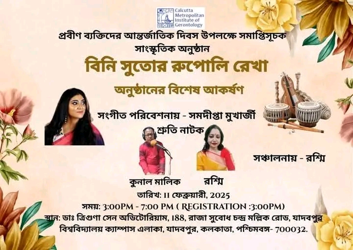 A special cultural event, "Bini Sutor Rupoli Rekha," ‘বিনি সুতোর রূপোলি রেখা’ has been organized by the Calcutta Metropolitan Institute of Gerontology to mark the International Day of Older Persons. The event featured a musical performance by Samdipta Mukherjee and an audio drama.