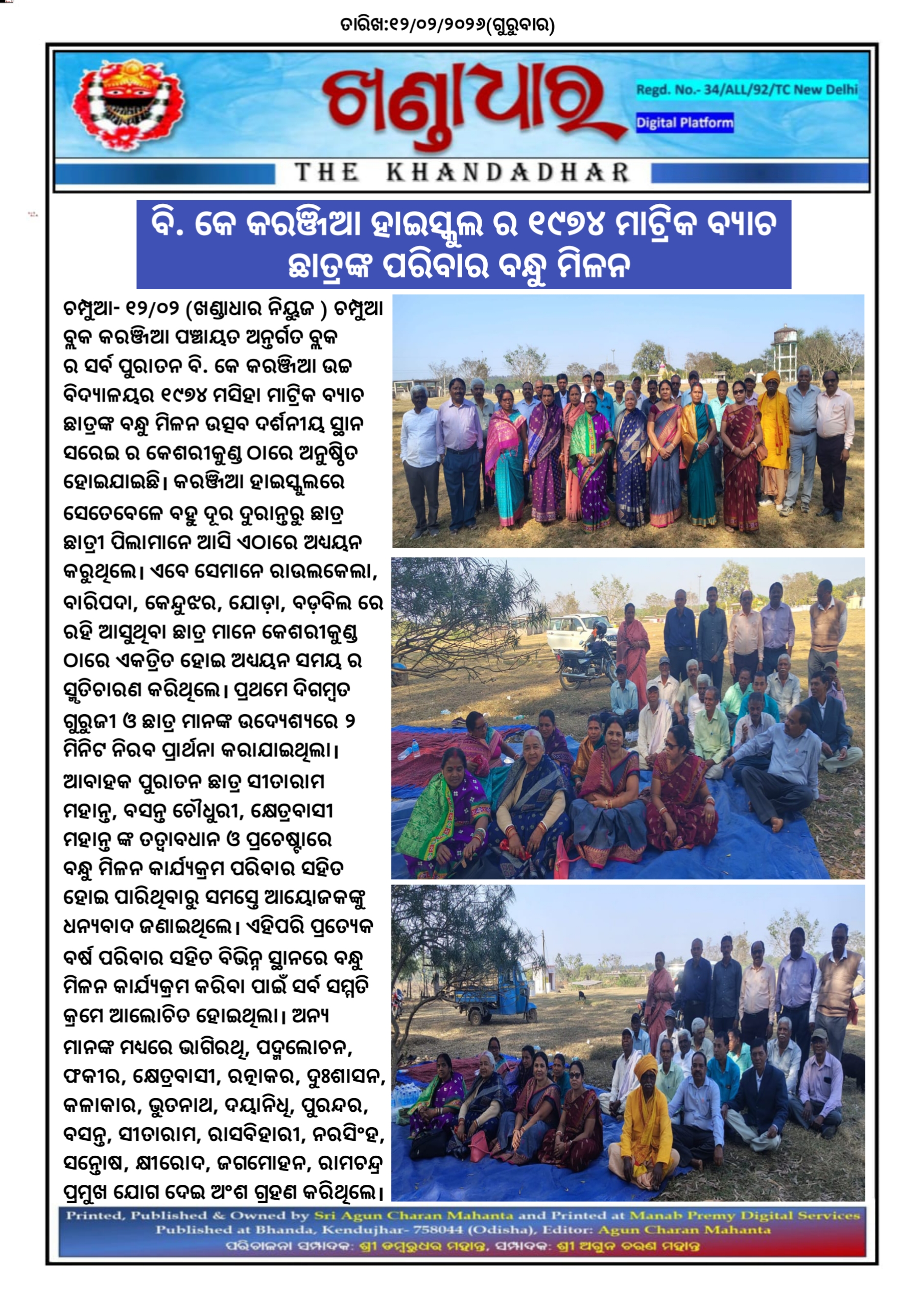 ଚମ୍ପୁଆ -୧୨/୦୨(ଖଣ୍ଡାଧାର ନିୟୁଜ ) ଚମ୍ପୁଆ ବ୍ଲକ କରଞ୍ଜିଆ ପଞ୍ଚାୟତ ଅନ୍ତର୍ଗତ ବ୍ଲକ ର ସର୍ବ ପୁରାତନ ବି. କେ କରଞ୍ଜିଆ ଉଚ୍ଚ ବିଦ୍ୟାଳୟର ୧୯୭୪ ମସିହା ମାଟ୍ରିକ ବ୍ୟାଚ ଛାତ୍ରଙ୍କ ବନ୍ଧୁ ମିଳନ ଉତ୍ସବ ଦର୍ଶନୀୟ ସ୍ଥାନ ସରେଇ ର କେଶରୀକୁଣ୍ଡ ଠାରେ ଅନୁଷ୍ଠିତ ହୋଇଯାଇଛି l କରଞ୍ଜିଆ ହାଇସ୍କୁଲରେ ସେତେବେଳେ ବହୁ ଦୂର ଦୁରାନ୍ତରୁ ଛାତ୍ର ଛାତ୍ରୀ ପିଲାମାନେ ଆସି ଏଠାରେ ଅଧ୍ୟୟନ କରୁଥିଲେ l ଏବେ ସେମାନେ ରାଉଲକେଲା, ବାରିପଦା, କେନ୍ଦୁଝର, ଯୋଡ଼ା, ବଡ଼ବିଲ ରେ ରହି ଆସୁଥିବା ଛାତ୍ର ମାନେ କେଶରୀକୁଣ୍ଡ ଠାରେ ଏକତ୍ରିତ ହୋଇ ଅଧ୍ୟୟନ ସମୟ ର ସ୍ମୃତିଚାରଣ କରିଥିଲେ l ପ୍ରଥମେ ଦିଗମ୍ବତ ଗୁରୁଜୀ ଓ ଛାତ୍ର ମାନଙ୍କ ଉଦ୍ୟେଶ୍ୟରେ ୨ ମିନିଟ ନିରବ ପ୍ରାର୍ଥନା କରାଯାଇଥିଲା l ଆବାହକ ପୁରାତନ ଛାତ୍ର ସୀତାରାମ ମହାନ୍ତ, ବସନ୍ତ ଚୌଧୁରୀ, କ୍ଷେତ୍ରବାସୀ ମହାନ୍ତ ଙ୍କ ତତ୍ଵାବଧାନ ଓ ପ୍ରଚେଷ୍ଟାରେ ବନ୍ଧୁ ମିଳନ କାର୍ଯ୍ୟକ୍ରମ ପରିବାର ସହିତ ହୋଇ ପାରିଥିବାରୁ ସମସ୍ତେ ଆୟୋଜକଙ୍କୁ ଧନ୍ୟବାଦ ଜଣାଇଥିଲେ l ଏହିପରି ପ୍ରତ୍ୟେକ ବର୍ଷ ପରିବାର ସହିତ ବିଭିନ୍ନ ସ୍ଥାନରେ ବନ୍ଧୁ ମିଳନ କାର୍ଯ୍ୟକ୍ରମ କରିବା ପାଇଁ ସର୍ବ ସମ୍ମତି କ୍ରମେ ଆଲୋଚିତ ହୋଇଥିଲା l ଅନ୍ୟ ମାନଙ୍କ ମଧ୍ୟରେ ଭାଗିରଥି, ପଦ୍ମଲୋଚନ, ଫକୀର, କ୍ଷେତ୍ରବାସୀ, ରତ୍ନାକର, ଦୁଃଶାସନ, କଳାକାର, ଭୁତନାଥ, ଦୟାନିଧି, ପୁରନ୍ଦର, ବସନ୍ତ, ସୀତାରାମ, ରାସବିହାରୀ, ନରସିଂହ, ସନ୍ତୋଷ, କ୍ଷୀରୋଦ, ଜଗମୋହନ, ରାମଚନ୍ଦ୍ର ପ୍ରମୁଖ ଯୋଗ ଦେଇ ଅଂଶ ଗ୍ରହଣ କରିଥିଲେ l