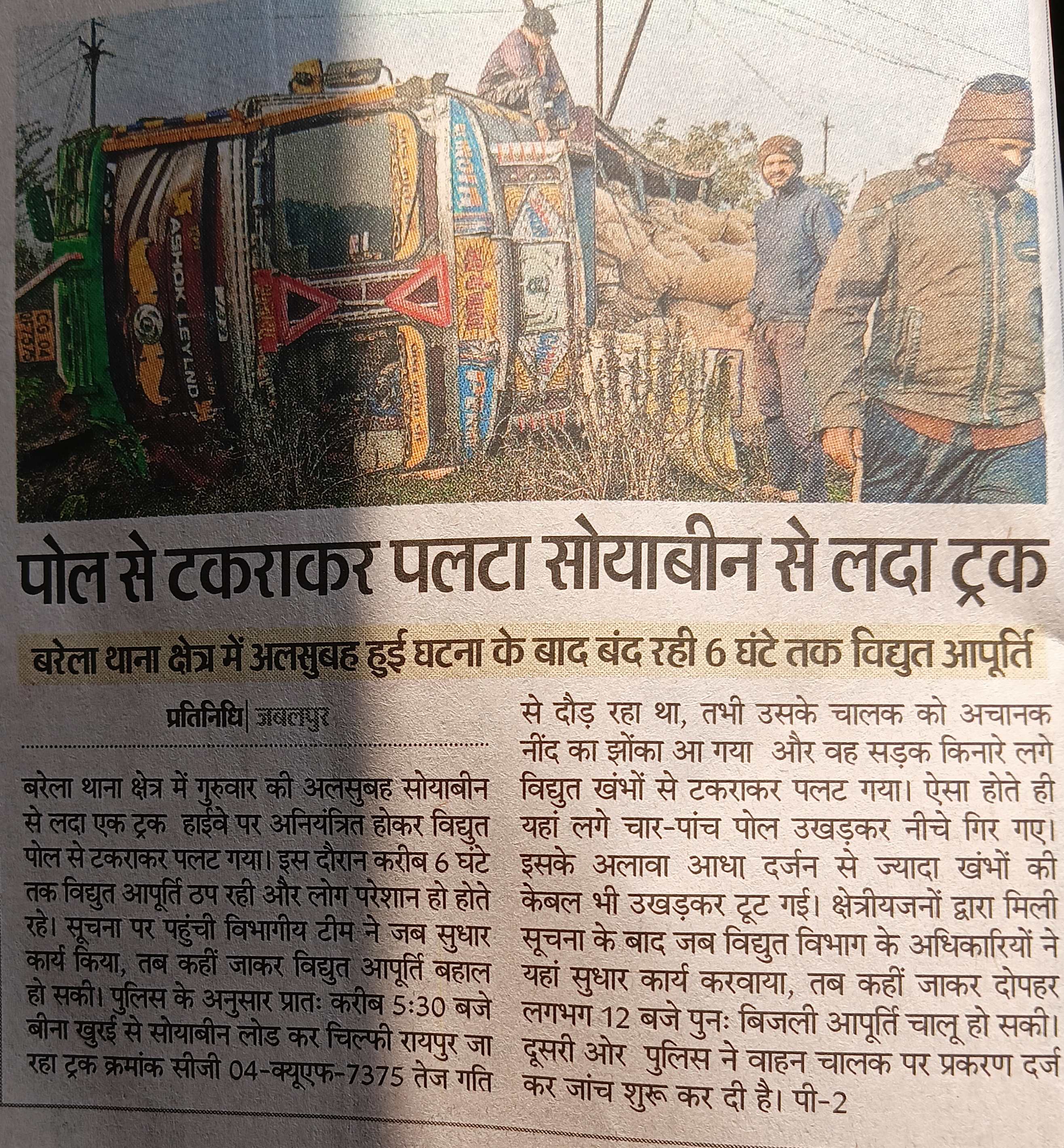 पोल से टकराकर पलटा सोयाबीन से लदा ट्रक