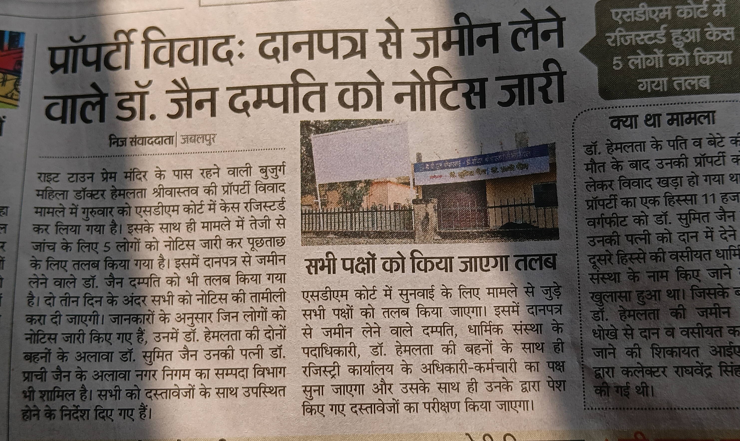प्रॉपर्टी विवाद दान पत्र से जमीन लेने वाले डॉक्टर जैन दंपति को नोटिस जारी