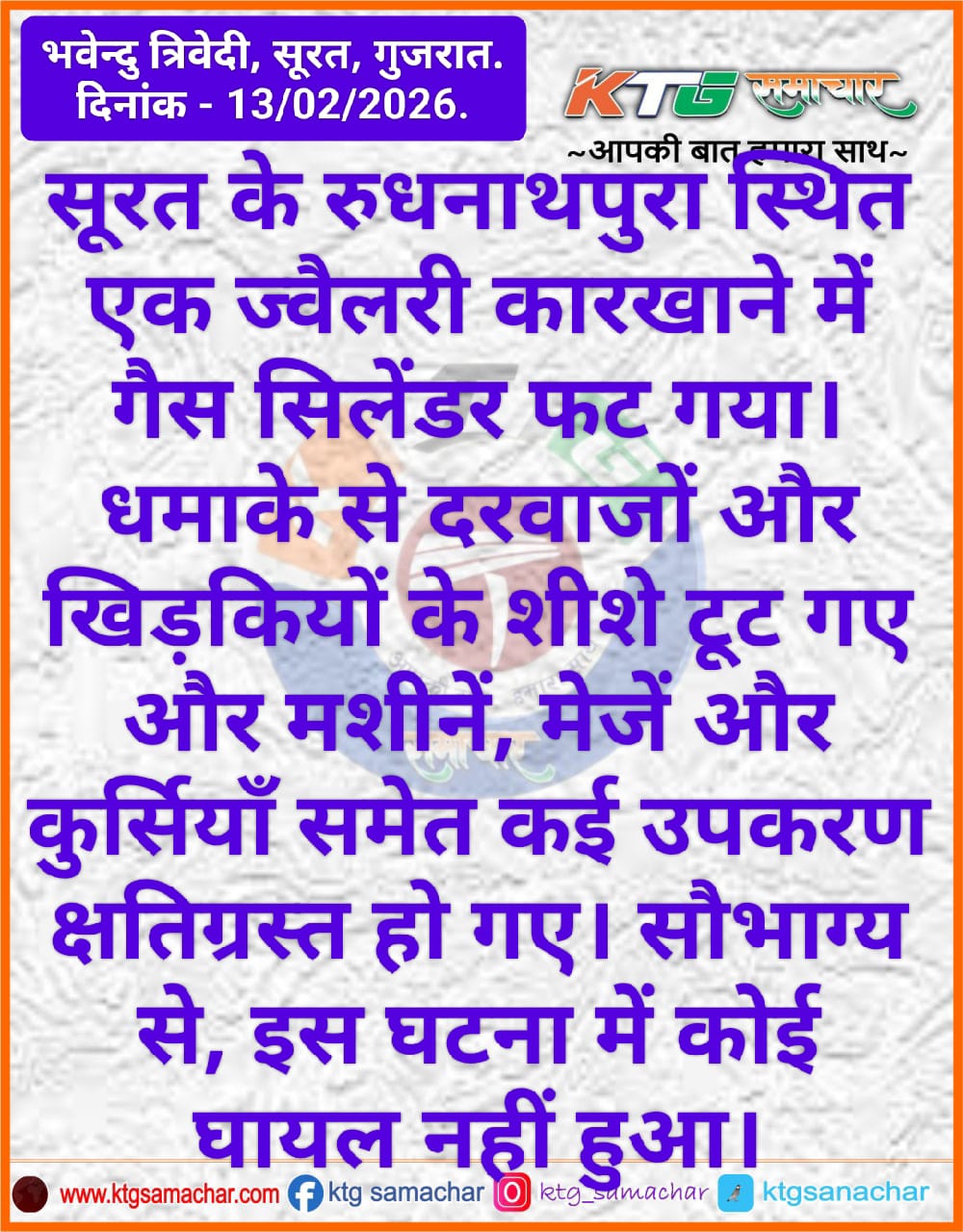 सूरत के रुधनाथपुरा स्थित एक ज्वेलरी कारखाने में गैस सिलेंडर फट गया।