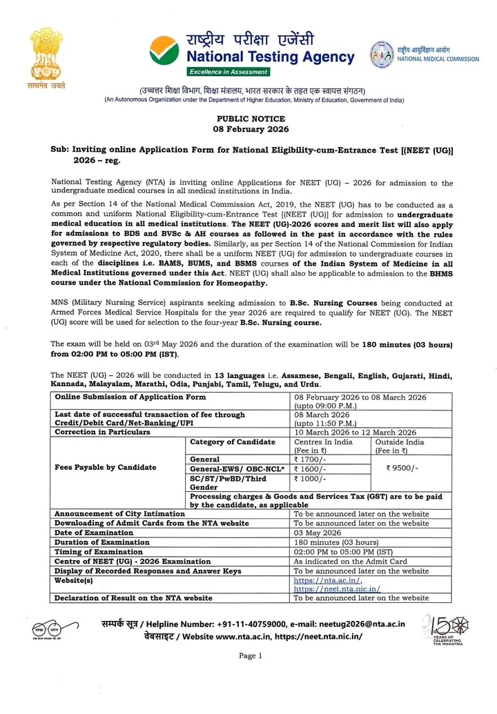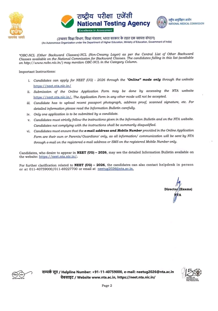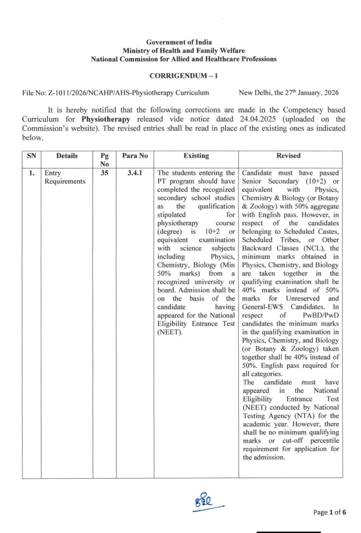 As per Corrigendum-1 dated 27 January 2026 issued by the National Commission for Allied and Healthcare Professions (NCAHP), New Delhi, a major change has been made in the eligibility criteria for Bachelor of Physiotherapy (BPT). #NEET (UG) is Now Mandatory for BPT Admission (2026–27 onwards) 🔹 In the revised Para 4.3.1.2 (Page 43) of NCAHP Physiotherapy Curriculum, it is clearly stated: “The candidate must have appeared in the National Eligibility Entrance Test (NEET) conducted by NTA for the academic year.” 🔹 Further, Para 4.3.1.3 mentions: Admission shall be based on NEET marks/merit. No minimum qualifying percentile is required for application. #Key_Points • NEET (UG) appearance is compulsory • Admission will be based on NEET merit • No separate entrance exam •50% PCB required (40% for reserved categories as applicable) • Applicable from Academic Session 2026–27 This clarification is officially notified under the NCAHP Act, 2021 and is binding on institutions offering BPT across India. All students aspiring for Physiotherapy must prepare accordingly and ensure they appear in NEET (UG) 2026. For authentic reference, please refer to: NCAHP Corrigendum-1 dated 27.01.2026 (Physiotherapy Curriculum Revision).