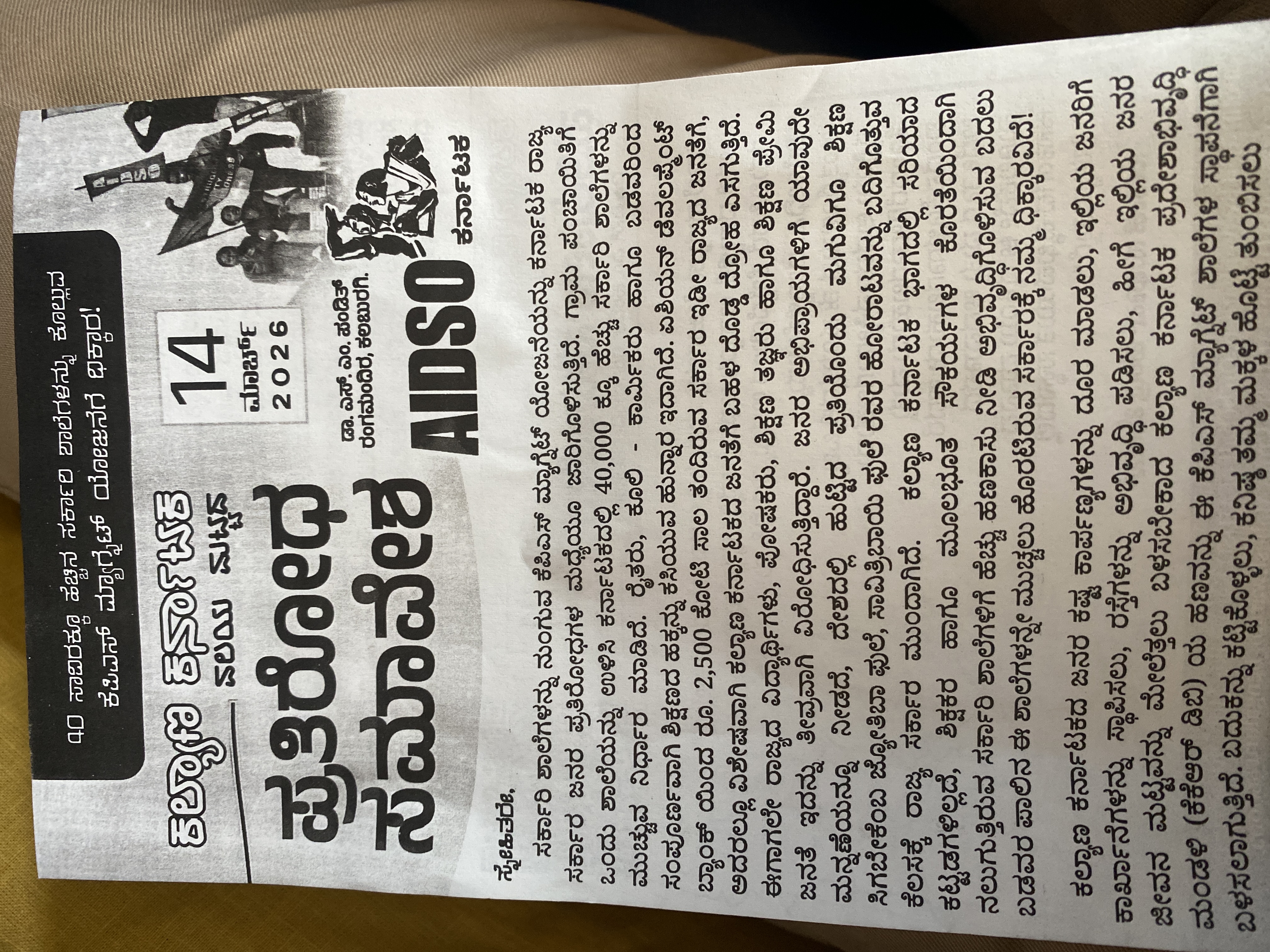 Kalaburagi: A protest convention has been called on March 14, 2026, at Dr. N.M. Hiremath Rangamandir in Kalaburagi opposing the State Government’s reported move to close or merge government schools across Karnataka. The event is being organized by AIDSO Karnataka.