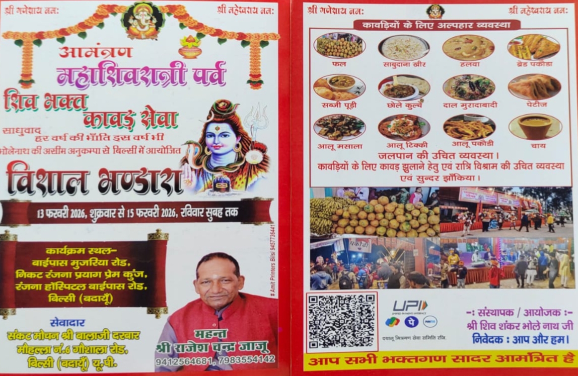 बिल्सी (बदायूँ): महाशिवरात्रि के पावन पर्व के अवसर पर संकट मोचन श्री वालाजी दरबार, मोहल्ला नं. 4, गोशाला रोड, बिल्सी की ओर से शिव भक्तों एवं कांवड़ यात्रियों की सेवा हेतु हर वर्ष की भांति इस वर्ष भी विशाल भंडारे का आयोजन किया जा रहा है। भोलेनाथ की असीम अनुकम्पा से आयोजित यह भंडारा 13 फरवरी 2026, शुक्रवार से प्रारंभ होकर 15 फरवरी 2026, रविवार प्रातः तक निरंतर चलेगा।