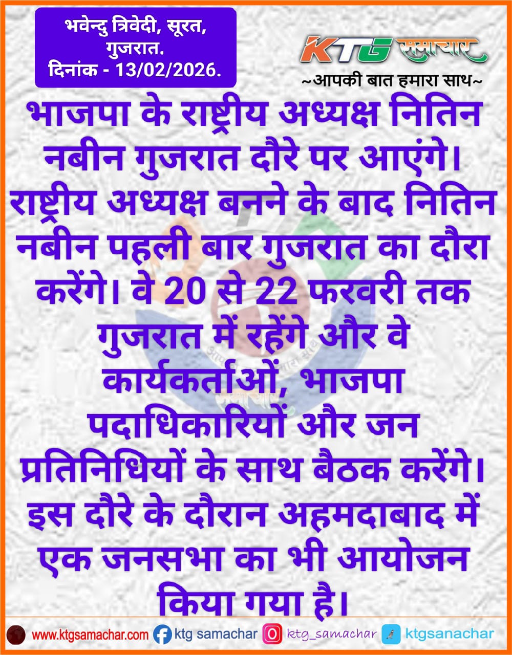 भाजपा के राष्ट्रीय अध्यक्ष नितिन नबीन गुजरात दौरे पर आएंगे।