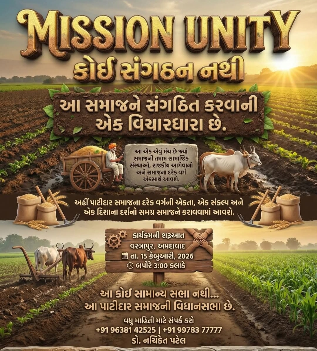 “Mission Unity – કોઈ સંગઠન નથી” એક વિચારધારા તરીકે રજૂ કરાયું છે. દાવો એવો છે કે પાટીદાર સમાજના તમામ સામાજિક સંગઠનો, રાજકીય આગેવાનો અને દરેક વર્ગને એક મંચ પર લાવવા પ્રયત્ન છે. એટલે સરળ ભાષામાં કહીએ તો, “એકતા માટે એક મંચ.”