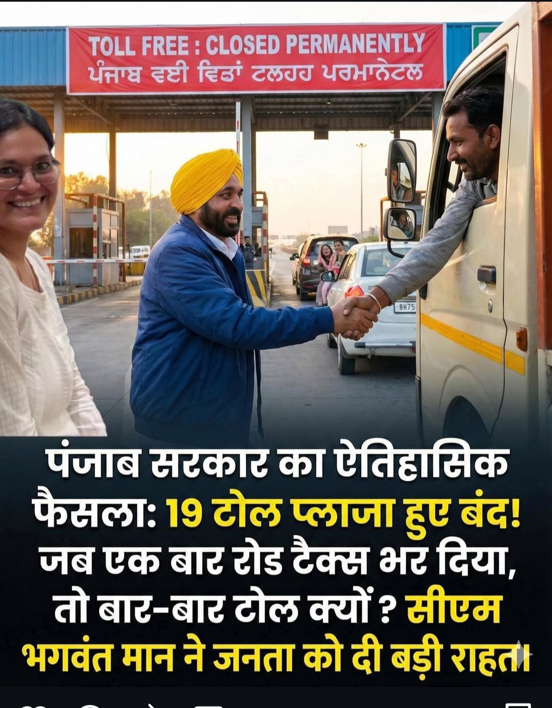 चंडीगढ़। Bhagwant Mann के नेतृत्व में पंजाब सरकार ने बड़ा और ऐतिहासिक फैसला लेते हुए राज्य के 19 टोल प्लाज़ा स्थायी रूप से बंद करने की घोषणा की है। मुख्यमंत्री ने कहा कि जब जनता पहले ही रोड टैक्स अदा कर चुकी है, तो बार-बार टोल वसूली करना उचित नहीं है।