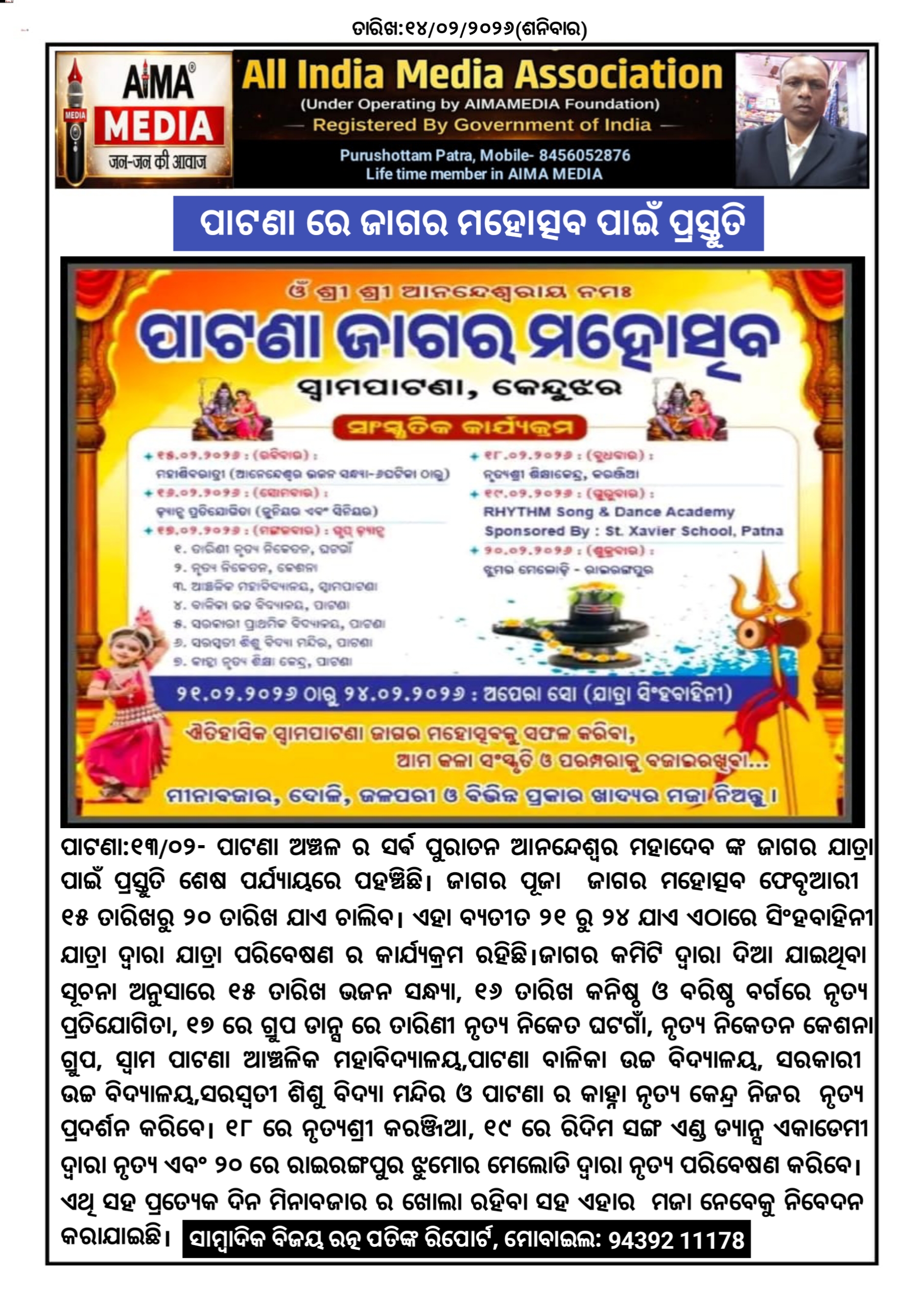 ପାଟଣା:୧୩/୦୨- ପାଟଣା ଅଞ୍ଚଳ ର ସର୍ଵ ପୁରାତନ ଆନନ୍ଦେଶ୍ୱର ମହାଦେବ ଙ୍କ ଜାଗର ଯାତ୍ରା ପାଇଁ ପ୍ରସ୍ତୁତି ଶେଷ ପର୍ଯ୍ୟାୟରେ ପହଞ୍ଚିଛି। ଜାଗର ପୂଜା ଜାଗର ମହୋତ୍ସବ ଫେବୃଆରୀ 15 ତାରିଖରୁ 20 ତାରିଖ ଯାଏ ଚାଲିବ। ଏହା ବ୍ୟତୀତ 21 ରୁ 24 ଯାଏ ଏଠାରେ ସିଂହବାହିନୀ ଯାତ୍ରା ଦ୍ୱାରା ଯାତ୍ରା ପରିବେଷଣ ର କାର୍ଯ୍ୟକ୍ରମ ରହିଛି। ଜାଗର କମିଟି ଦ୍ୱାରା ଦିଆ ଯାଇଥିବା ସୂଚନା ଅନୁସାରେ 15 ତାରିଖ ଭଜନ ସନ୍ଧ୍ୟା, 16 ତାରିଖ କନିଷ୍ଠ ଓ ବରିଷ୍ଠ ବର୍ଗରେ ନୃତ୍ୟ ପ୍ରତିଯୋଗିତା, 17 ରେ ଗ୍ରୁପ ଡାନ୍ସ ରେ ତାରିଣୀ ନୃତ୍ୟ ନିକେତ ଘଟଗାଁ, ନୃତ୍ୟ ନିକେତନ କେଶନା ଗ୍ରୁପ, ସ୍ୱାମ ପାଟଣା ଆଞ୍ଚଳିକ ମହାବିଦ୍ୟାଳୟ,ପାଟଣା ବାଳିକା ଉଚ୍ଚ ବିଦ୍ୟାଳୟ, ସରକାରୀ ଉଚ୍ଚ ବିଦ୍ୟାଳୟ,ସରସ୍ୱତୀ ଶିଶୁ ବିଦ୍ୟା ମନ୍ଦିର, ଓ ପାଟଣା ର କାହ୍ନା ନୃତ୍ୟ କେନ୍ଦ୍ର ନିଜର ନୃତ୍ୟ ପ୍ରଦର୍ଶନ କରିବେ।18 ରେ ନୃତ୍ୟଶ୍ରୀ କରଞ୍ଜିଆ,19 ରେ ରିଦିମ ସଙ୍ଗ ଏଣ୍ଡ ଡ୍ୟାନ୍ସ ଏକାଡେମୀ ଦ୍ୱାରା ନୃତ୍ୟ ଏବଂ 20 ରେ ରାଇରଙ୍ଗପୁର ଝୁମୋର ମେଲୋଡି ଦ୍ୱାରା ନୃତ୍ୟ ପରିବେଷଣ କରିବେ। ଏଥି ସହ ପ୍ରତ୍ୟେକ ଦିନ ମିନାବଜାର ର ଖୋଲା ରହିବା ସହ ଏହାର ମଜା ନେବେକୁ ନିବେଦନ କରାଯାଇଛି।