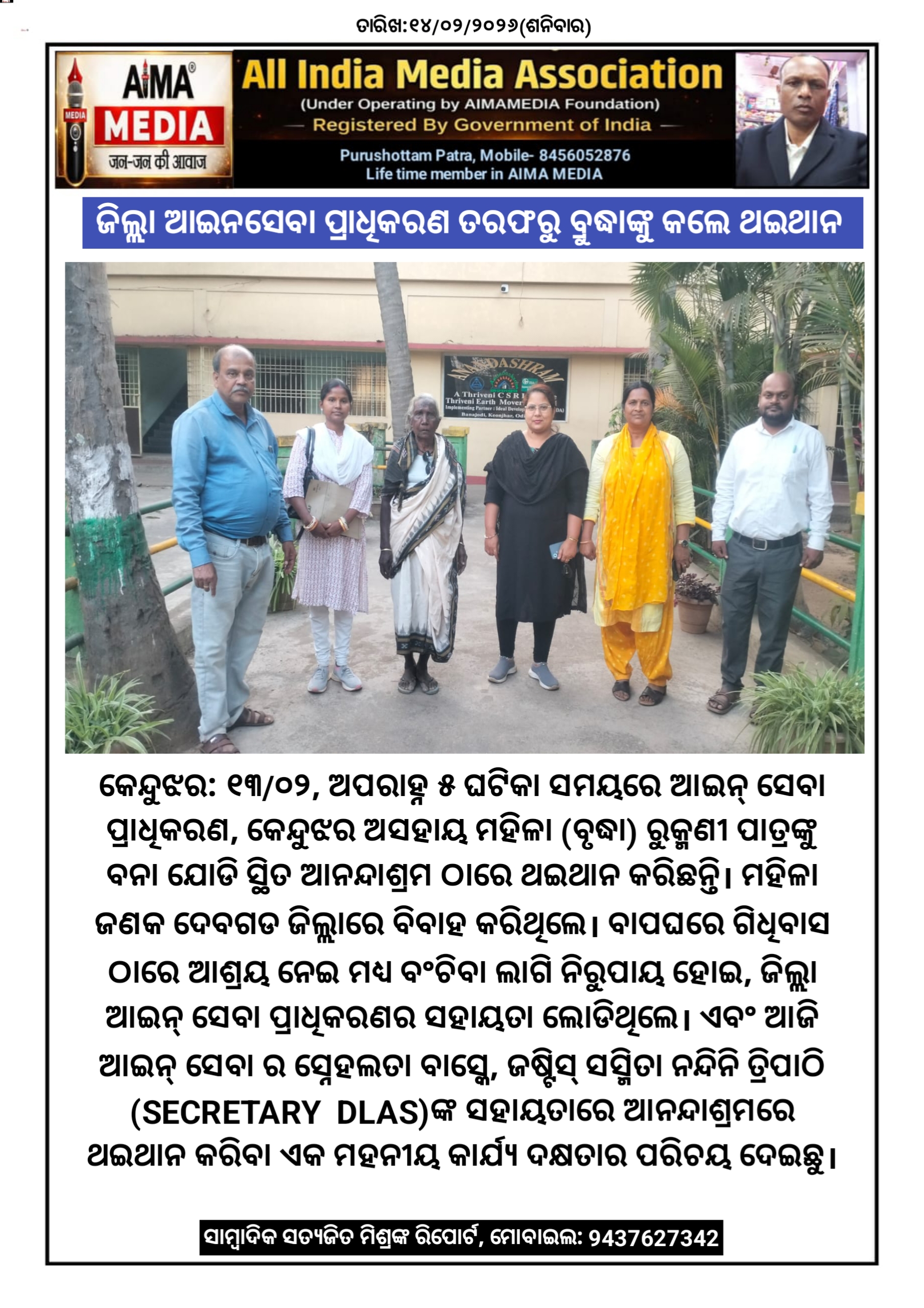 କେନ୍ଦୁଝର: ତା ୧୩/୦୨/୨୦୨୬ ରିଖ ଅପରାହ୍ନ ୫ ଘଟିକା ସମୟରେ ଆଇନ୍ ସେବା ପ୍ରାଧିକରଣ, କେନ୍ଦୁଝର ଅସହାୟ ମହିଳା ( ବୃଦ୍ଧା ) ରୁକ୍ମଣୀ ପାତ୍ରଙ୍କୁ ବନା ଯୋଡି ସ୍ଥିତ ଆନନ୍ଦାଶ୍ରମ ଠାରେ ଥଇଥାନ କରିଛନ୍ତି । ମହିଳା ଜଣକ ଦେବଗଡ ଜିଲ୍ଲାରେ ବିବାହ କରିଥିଲେ । ବାପଘରେ ଗିଧିବାସ ଠାରେ ଆଶ୍ରୟ ନେଇ ମଧ୍ୟ ବଂଚିବା ଲାଗି ନିରୁପାୟ ହୋଇ, ଜିଲ୍ଲା ଆଇନ୍ ସେବା ପ୍ରାଧିକରଣର ସହାୟତା ଲୋଡିଥିଲେ । ଏବଂ ଆଜି ଆଇନ୍ ସେବା ର ସ୍ନେହଲତା ବାସ୍କେ, ଜଷ୍ଟିସ୍ ସସ୍ମିତା ନନ୍ଦିନି ତ୍ରିପାଠି ( SECRETARY DLAS ) ଙ୍କ ସହାୟତାରେ ଆନନ୍ଦାଶ୍ରମରେ ଥଇଥାନ କରିବା ଏକ ମହନୀୟ କାର୍ଯ୍ୟ ଦକ୍ଷତାର ପରିଚୟ ଦେଇଛୁ ।