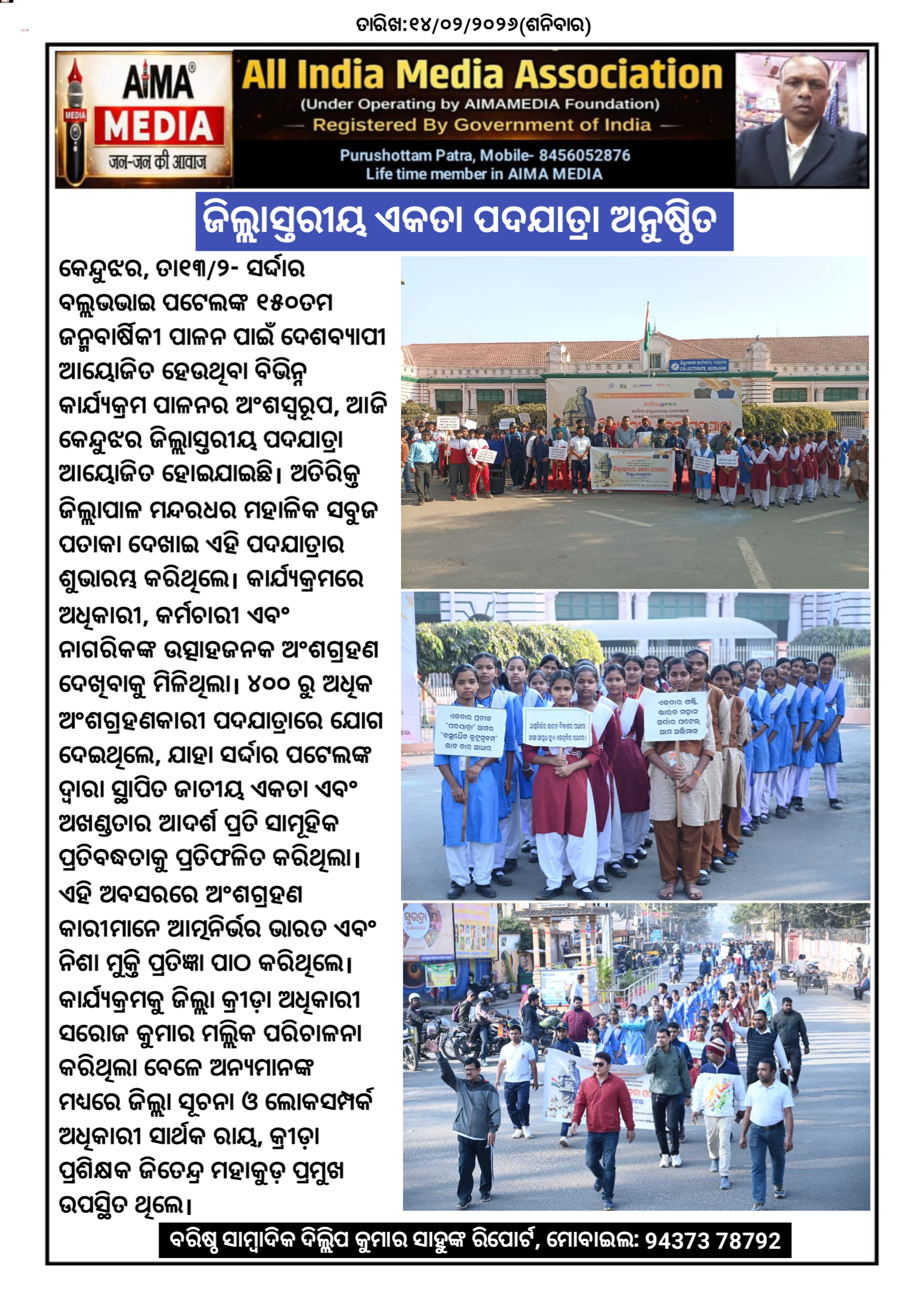 କେନ୍ଦୁଝର, ତା୧୩/୨- ସର୍ଦ୍ଦାର ବଲ୍ଲଭଭାଇ ପଟେଲଙ୍କ ୧୫୦ତମ ଜନ୍ମବାର୍ଷିକୀ ପାଳନ ପାଇଁ ଦେଶବ୍ୟାପୀ ଆୟୋଜିତ ହେଉଥିବା ବିଭିନ୍ନ କାର୍ଯ୍ୟକ୍ରମ ପାଳନର ଅଂଶସ୍ୱରୂପ, ଆଜି କେନ୍ଦୁଝର ଜିଲ୍ଲାସ୍ତରୀୟ ପଦଯାତ୍ରା ଆୟୋଜିତ ହୋଇଯାଇଛି। ଅତିରିକ୍ତ ଜିଲ୍ଲାପାଳ ମନ୍ଦରଧର ମହାଳିକ ସବୁଜ ପତାକା ଦେଖାଇ ଏହି ପଦଯାତ୍ରାର ଶୁଭାରମ୍ଭ କରିଥିଲେ। କାର୍ଯ୍ୟକ୍ରମରେ ଅଧିକାରୀ, କର୍ମଚାରୀ ଏବଂ ନାଗରିକଙ୍କ ଉତ୍ସାହଜନକ ଅଂଶଗ୍ରହଣ ଦେଖିବାକୁ ମିଳିଥିଲା। ୪୦୦ ରୁ ଅଧିକ ଅଂଶଗ୍ରହଣକାରୀ ପଦଯାତ୍ରାରେ ଯୋଗ ଦେଇଥିଲେ, ଯାହା ସର୍ଦ୍ଦାର ପଟେଲଙ୍କ ଦ୍ୱାରା ସ୍ଥାପିତ ଜାତୀୟ ଏକତା ଏବଂ ଅଖଣ୍ଡତାର ଆଦର୍ଶ ପ୍ରତି ସାମୂହିକ ପ୍ରତିବଦ୍ଧତାକୁ ପ୍ରତିଫଳିତ କରିଥିଲା। ଏହି ଅବସରରେ ଅଂଶଗ୍ରହଣକାରୀମାନେ ଆତ୍ମନିର୍ଭର ଭାରତ ଏବଂ ନିଶା ମୁକ୍ତି ପ୍ରତିଜ୍ଞା ପାଠ କରିଥିଲେ। କାର୍ଯ୍ୟକ୍ରମକୁ ଜିଲ୍ଲା କ୍ରୀଡ଼ା ଅଧିକାରୀ ସରୋଜ କୁମାର ମଲ୍ଲିକ ପରିଚାଳନା କରିଥିଲା ବେଳେ ଅନ୍ୟମାନଙ୍କ ମଧ୍ୟରେ ଜିଲ୍ଲା ସୂଚନା ଓ ଲୋକସମ୍ପର୍କ ଅଧିକାରୀ ସାର୍ଥକ ରାୟ, କ୍ରୀଡ଼ା ପ୍ରଶିକ୍ଷକ ଜିତେନ୍ଦ୍ର ମହାକୁଡ଼ ପ୍ରମୁଖ ଉପସ୍ଥିତ ଥିଲେ।