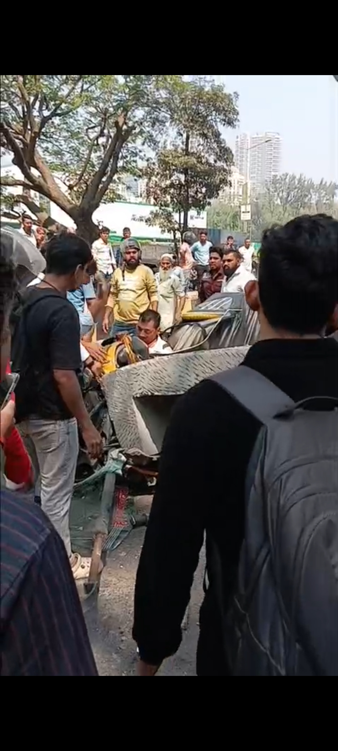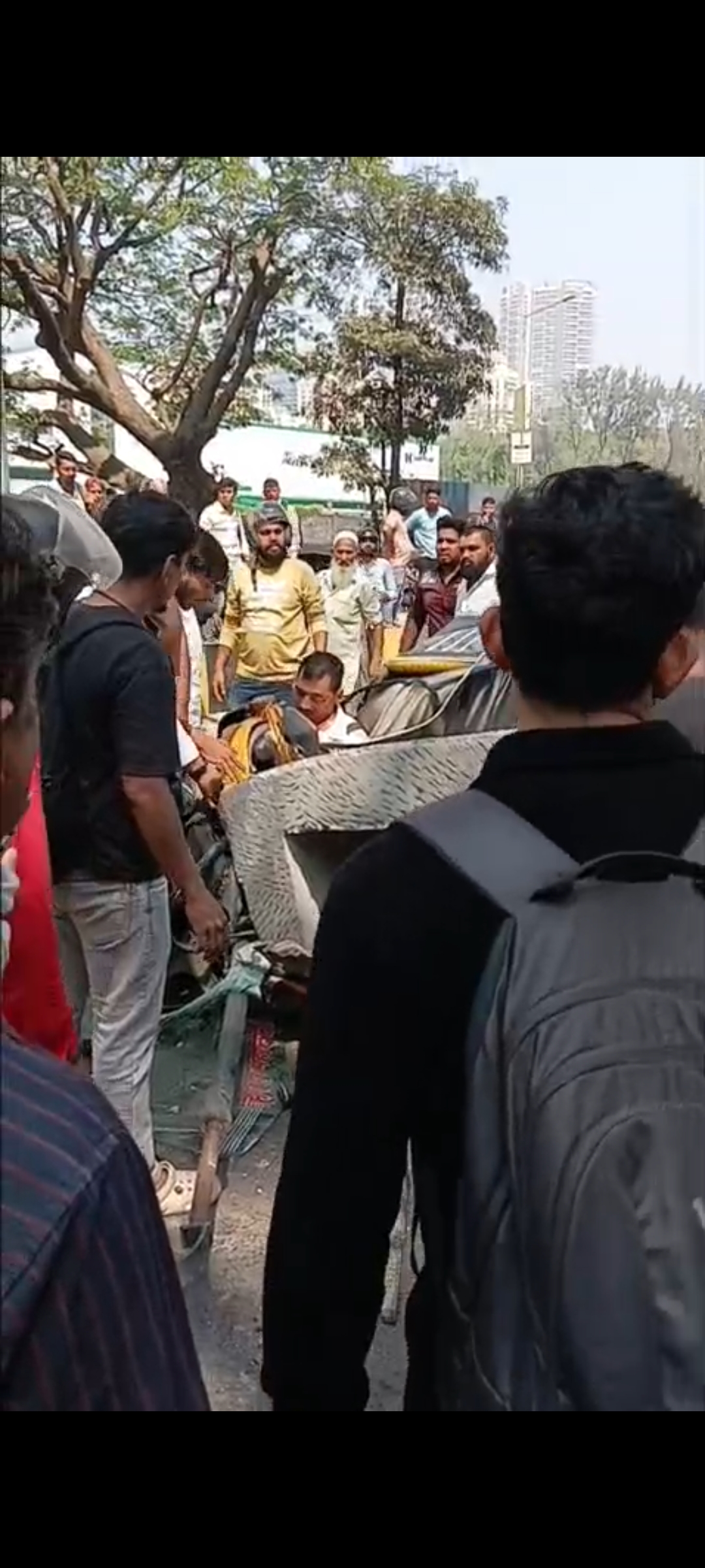 The auto-rickshaw was completely smashed, and a car was also damaged.