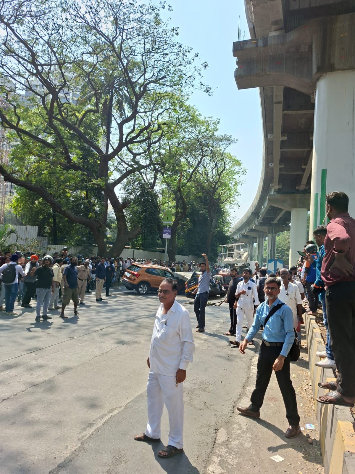 A portion of a cement pillar/parapet segment from the under-construction Mumbai Metro Line 4 collapsed and fell directly onto an auto-rickshaw and a car.