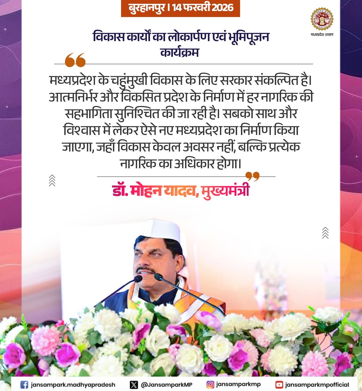 मध्यप्रदेश के चहुंमुखी विकास के लिए सरकार संकल्पित है। आत्मनिर्भर और विकसित प्रदेश के निर्माण में हर नागरिक की सहभागिता सुनिश्चित की जा रही है।