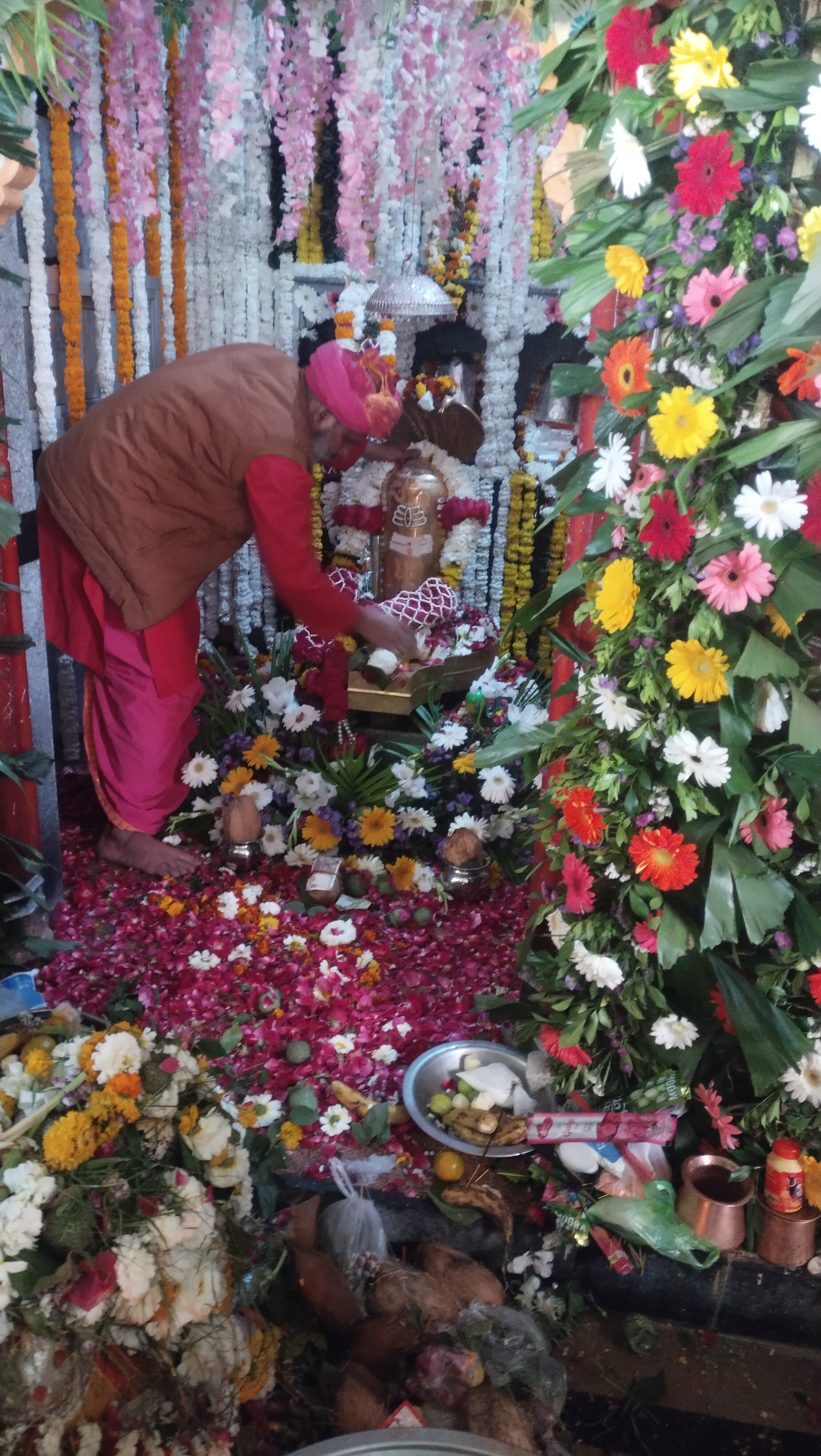 शिवलिंग को फूलों की मालाओं और बेलपत्र से सजाया गया है।