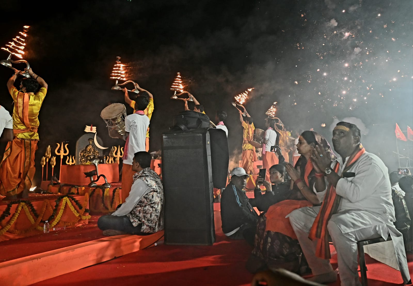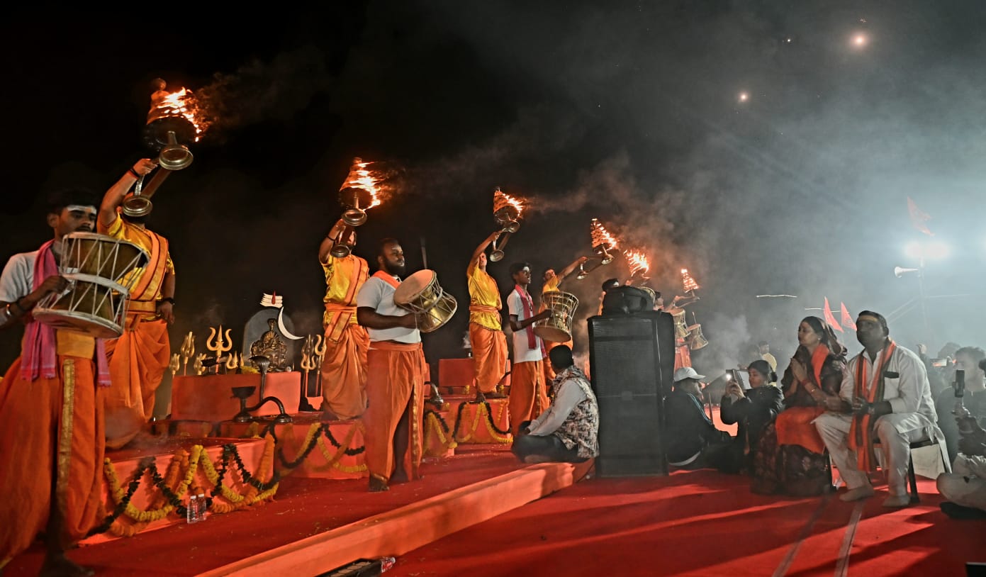 इस अवसर पर बनारस के अस्सी घाट से आए प्रसिद्ध संत आशुतोष महाराज जी के नेतृत्व में पंडितों के समूह द्वारा वैदिक मंत्रोच्चारण के साथ आरती संपन्न कराई गई। पूरे घाट क्षेत्र में “हर हर महादेव” और “भोलेनाथ की जय” के गगनभेदी नारों से वातावरण शिवमय हो उठा।