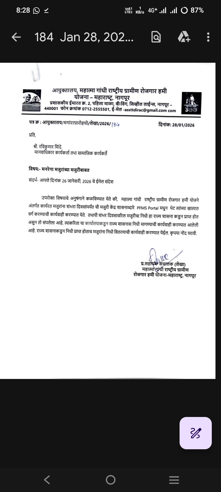 याबाबत मनरेगा विभाग, महाराष्ट्र (नागपूर) कार्यालयाकडून दिनांक 26जानेवारी 2026 रोजी दिलेल्या पत्रात मजुरी निधी राज्य शासनाकडून प्राप्त झाल्यानंतर वितरण प्रक्रिया करण्यात येत असल्याचे नमूद करण्यात आले आहे. तसेच मजुरी PFMS प्रणालीद्वारे मजुरांच्या खात्यात जमा करण्याची कार्यवाही सुरू असल्याचे सांगण्यात आले होते. मात्र प्रत्यक्षात तीन महिने उलटूनही मजुरांना पैसे मिळाले नसल्याने प्रशासनाच्या कार्यपद्धतीवर प्रश्नचिन्ह निर्माण झाले आहे.
