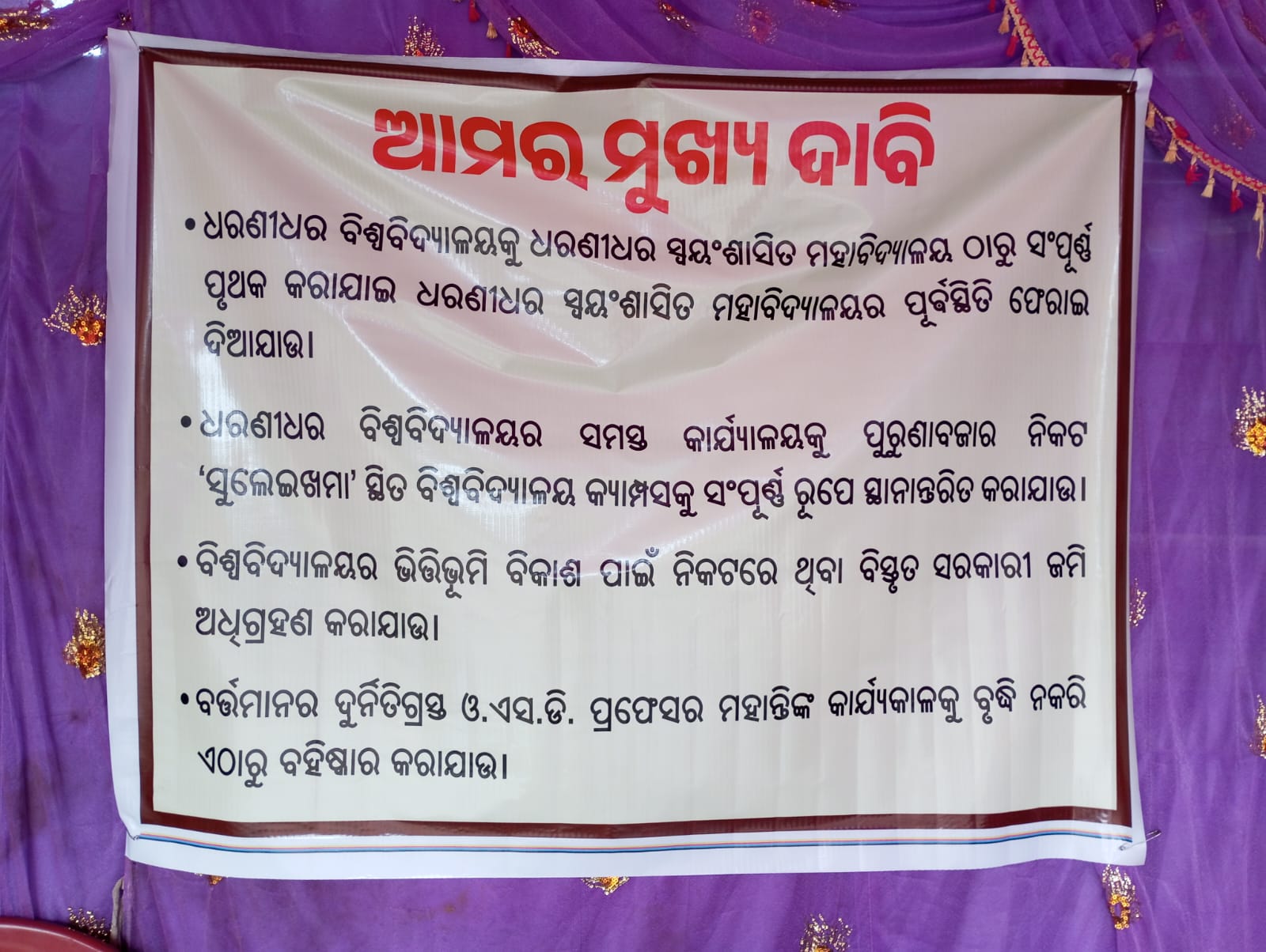 ଆମର ଉଦ୍ଦେଶ୍ଯ ନୁହେଁ ଯେ ନିର୍ଦ୍ଦିଷ୍ଟ ଭାବରେ କୌଣସି ରାଜନୈତିକ ଦଳ କିମ୍ବା ନେତା ମନ୍ତ୍ରୀ ଅଥବା ବ୍ଯକ୍ତି ବିଶେଷ, ପ୍ରଶାସନ ଏବଂ ପ୍ରଶାସନିକ ପଦାଧିକାରୀ ମାନଙ୍କୁ ଅପମାନିତ ଓ ନିନ୍ଦା କରିବା। ଆମର ଗୋଟିଏ ମାତ୍ର ଉଦ୍ଦେଶ୍ଯ କେନ୍ଦୁଝର ଜିଲ୍ଲାର ସ୍ବାର୍ଥ ପାଇଁ ପୁନର୍ବାର ଧରଣୀଧର ସ୍ବୟଂ ଶାସିତ ମହାବିଦ୍ୟାଳୟ ସ୍ଥାପନ କରାଯାଉ। ସେଥିପାଇଁ ଏହା ଏକ ନିରନ୍ତର ଅଭିଯାନ ଜାରି ରହିବ; ଜନସଚେତନତା ଓ ଜନଜାଗରଣ କରିବା ପାଇଁ ଲୋକଙ୍କ ନିକଟରେ ଉଚିତ୍ ସନ୍ଦେଶ ପହଞ୍ଚାଇବା ପ୍ରତ୍ୟେକ ଜିଲ୍ଲା ବାସୀଙ୍କର ନୈତିକ ଦାୟିତ୍ୱ। ଏହି ପରିପ୍ରେକ୍ଷୀରେ ଭଗବାନଙ୍କର ଗୋଟିଏ ଦିବ୍ୟ ବାଣୀ ସଂକ୍ଷେପରେ ପ୍ରକାଶିତ କରୁଅଛି। ଏହି ଦିବ୍ୟ ବାଣୀ ଶ୍ରୀମଦ୍ଭଗବଦଗୀତାରେ ଉଲ୍ଲେଖ ରହିଛି। ଭଗବାନ ଶ୍ରୀକୃଷ୍ଣ ତାଙ୍କର ଦିବ୍ୟ ବାଣୀରେ ସ୍ପଷ୍ଟ ପ୍ରକାଶ କରି କହିଛନ୍ତି। "ସମସ୍ତ ପ୍ରାଣୀ ଅନ୍ନରୁ ଉତ୍ପନ୍ନ ହୁଅନ୍ତି; ଅନ୍ନର ଉତ୍ପତ୍ତି ବ୍ରୁଷ୍ଟିରୁ ହୁଏ; ବ୍ରୁଷ୍ଟି ଯଜ୍ଞରୁ ହୁଏ ଏବଂ ଯଜ୍ଞ ବିହିତ କର୍ମରୁ ଉତ୍ପନ୍ନ ହୁଏ। କର୍ମ ସମୁଦାୟ ବେଦରୁ ଉତ୍ପନ୍ନ ହୁଅନ୍ତି ଏବଂ ବେଦ ଅବିନାଶୀ ପରମାତ୍ମାଙ୍କ ଠାରୁ ଉତ୍ପନ୍ନ ହୋଇଛନ୍ତି ବୋଲି ଜାଣ। ତେଣୁ ସିଦ୍ଧ ହେଲା ଯେ, ସର୍ବବ୍ୟାପୀ ପରମ ଅକ୍ଷର ପରମାତ୍ମା ସଦାସର୍ବଦା ଯଜ୍ଞରେ ପ୍ରତିଷ୍ଠିତ।" ଏହି କଥା ତ୍ରୁତୀୟ ଅଧ୍ୟାୟ ଚଉଦ ଏବଂ ପନ୍ଦର ନମ୍ବର ଶ୍ଳୋକରେ ବର୍ଣ୍ଣନା କରାଯାଇଛି। ବିନା ବିଦ୍ୟାରେ ବିହିତ କର୍ମ ଓ ଯଜ୍ଞାନୁଷ୍ଠାନ କରିବା ନିରର୍ଥକତାର ପରିଚୟ ଅଟେ। ଶିକ୍ଷାନୁଷ୍ଠାନ ଗୁଡିକ ଗୋଟିଏ ଗୋଟିଏ ବ୍ରୁହତ ଯଜ୍ଞକୁଣ୍ଡ କହିଲେ ଭୁଲ୍ ହେବନାହିଁ। ଏଠାରେ ସାମୁହିକ ଭାବରେ ଶିକ୍ଷା ପ୍ରଦାନ କରାଯାଏ; ଏହି ଯଜ୍ଞକୁଣ୍ଡ ସଦ୍ରୁଶ୍ୟ ଶିକ୍ଷାନୁଷ୍ଠାନ ଗୁଡିକରେ ବିଦ୍ୟାର୍ଥୀ ମାନଙ୍କୁ ଶିକ୍ଷା ପ୍ରଦାନ କରି ସଂସ୍କାର କରାଯାଏ। ଏହି ଶିକ୍ଷାନୁଷ୍ଠାନ ଗୁଡିକରୁ ଯଜ୍ଞକୁଣ୍ଡରେ ଯେଉଁ ବିଦ୍ୟାରୂପୀ ଆହୁତି ଦ୍ବାରା ବିଦ୍ୟାର୍ଥୀ ମାନେ ଉତ୍ପନ୍ନ ହୁଅନ୍ତି। ସେହିମାନଙ୍କ ଦ୍ବାରା ହିଁ ପ୍ରଗତିଶୀଳ ସମାଜ ଗଠନକୁ ମଜବୁତ କରିଥାନ୍ତି। ଏକ ସୁଦୃଢ଼ ଶ୍ରୁଙ୍ଖଳିତ ମାନବସମାଜ ଓ ଅର୍ଥନୈତିକ ବିକାଶଶୀଳ କରିବା ପାଇଁ ଏହି ବିଦ୍ୟାର୍ଥୀ ମାନଙ୍କର ଭୂମିକା ଅତି ଗୁରୁତ୍ବପୂର୍ଣ୍ଣ ଦାୟିତ୍ୱ ନିର୍ବାହ କରନ୍ତି। ଏଥିପାଇଁ ତୋ ଧରଣୀଧର ସ୍ବୟଂ ଶାସିତ ମହାବିଦ୍ୟାଳୟ ପୁନର୍ବାର ସ୍ଥାପନ କରିବା ନିତାନ୍ତ ଆବଶ୍ଯକ ରହିଛି। ଏହା ରାଷ୍ଟ୍ର, ରାଜ୍ୟ ଓ ଜିଲ୍ଲାର ପ୍ରଗତି ଏବଂ ବିକାଶ ଧାରାକୁ ପ୍ରଶସ୍ତ କରିବ। ଏପରିକି ଆଗାମୀ ଭବିଷ୍ଯତ ପୀଢୀର ବଂଶଧରମାନଙ୍କ ପାଇଁ ସ୍ବାବଲମ୍ବୀ ଓ ସ୍ବାଭିମାନି ଶ୍ରୁଙ୍ଖଳିତ ନାଗରିକ ସମାଜର ମୁଳଦୁଆ ମଜବୁତ କରିବ। ଜିଲ୍ଲାବାସୀଙ୍କୁ ଅନୁରୋଧ ଏବାବଦରେ ଚିନ୍ତନ କରିବା ନିତାନ୍ତ ଆବଶ୍ଯକ ରହିଛି। ଯଦି ଆର୍ଥିକ ବିକାଶ ଓ ଜିଲ୍ଲାର ବିକାଶ ଆଶା ରଖିଛନ୍ତି; ତେବେ ଶିକ୍ଷାର ବିକାଶ ହେବା ନିତାନ୍ତ ଜରୁରୀ। କେନ୍ଦୁଝର ଜିଲ୍ଲାର ସ୍ବାର୍ଥ ପାଇଁ ଧରଣୀଧର ସ୍ବୟଂ ଶାସିତ ମହାବିଦ୍ୟାଳୟ ପୁନର୍ବାର ସ୍ଥାପନ କରିବା ନିତାନ୍ତ ଆବଶ୍ଯକ। ନଚେତ୍ ବିକାଶ ଏବଂ ପ୍ରଗତି ଏକ ସଂଳାପ ମଧ୍ୟରେ ସିମିତ ହୋଇ ରହିଯିବ!