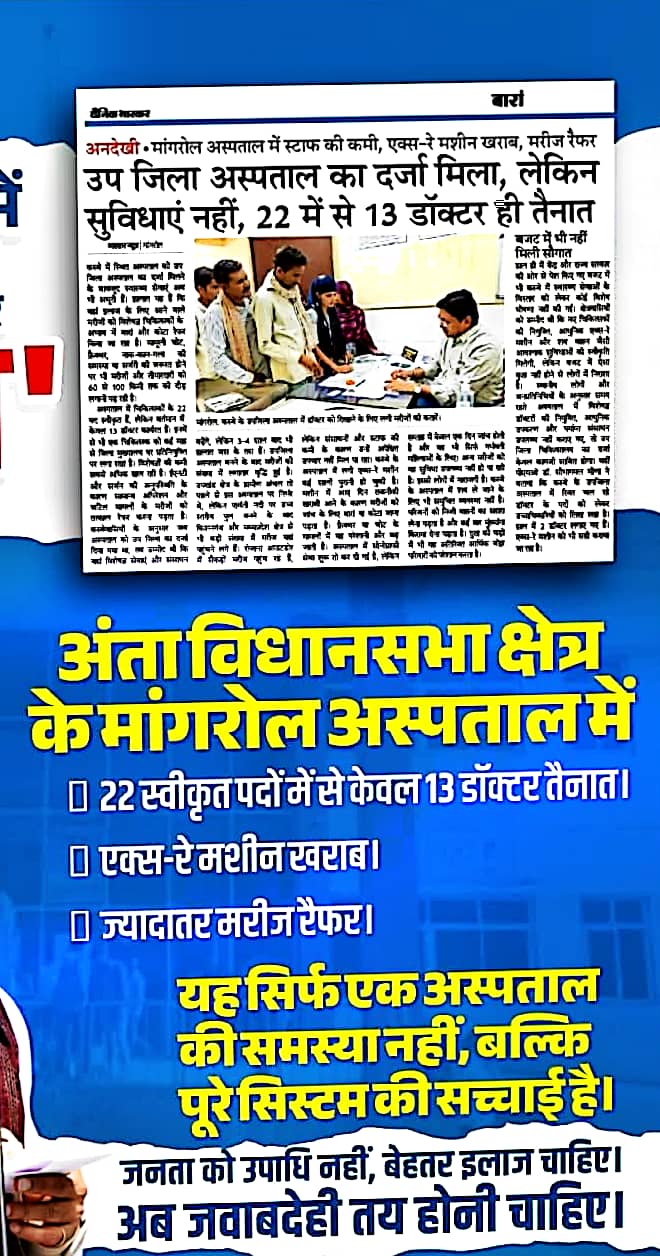 मांगरोल दिनांक 16 फरवरी 2026 रिपोर्टर रामप्रसाद बेरवा सेवानिवृत्ति प्रधानाचार्य मांगरोल। मांगरोल के उप जिला अस्पताल में मांगरोल के पेंशनर भगवान भरोसे उनका इलाज किया जाता है। मांगरोल में उप जिला अस्पताल में विशेषज्ञों के बहुत अधिक पद खाली पड़े हुए हैं केवल बारह पदों पर ही चिकित्सक अपने सेवाए दे रहे हैं। राजस्थान सरकार के आदेश अनुसार पेंशनर और सरकारी कर्मचारी को मासिक इलाज के लिए एम डी डिग्री धारी चिकित्सक ही इलाज कर सकता है। दूसरे अन्य कनिष्ठ चिकित्सक उसका इलाज नहीं कर पाते। अस्पताल में ई एन टी एवं सर्जन की सुविधाओं के अभाव में ऑपरेशन नहीं हो पाते। हृदय रोग एवं लकवा ग्रस्त पेंशनर मरीजों के लिए विशेषज्ञों की कोई सुविधा उपलब्ध नहीं है। उप जिला अस्पताल मांगरोल की नवनिर्मित भवन में स्वास्थ्य एवं चिकित्सा संसाधनों का अभाव होने से भवन का कोई औचित्य नहीं है। पेंशनरों को जिला अस्पताल बारा में या कोटा जाकर अपना इलाज करवाना पड़ता है। उप जिला अस्पताल मांगरोल के बारे में राजस्थान सरकार के संपर्क पोर्टल पर शिकायत दर्ज की जा चुकी है। लेकिन राजस्थान सरकार के जिम्मेदार अधिकारियो के द्वारा कोई कार्यवाही अभी तक नहीं हो पाई है।